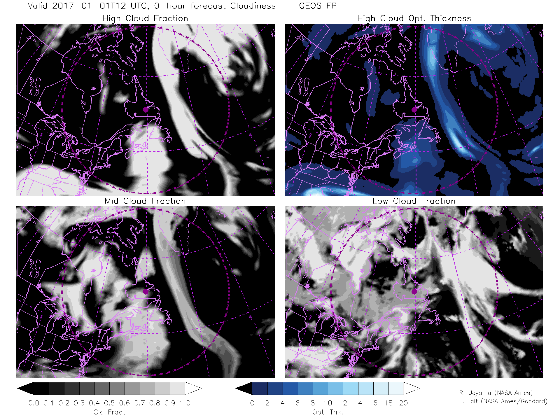 GEOS Forecast Cloud Fraction (High, Mid, Low) & High Cloud Opticlal Thickness