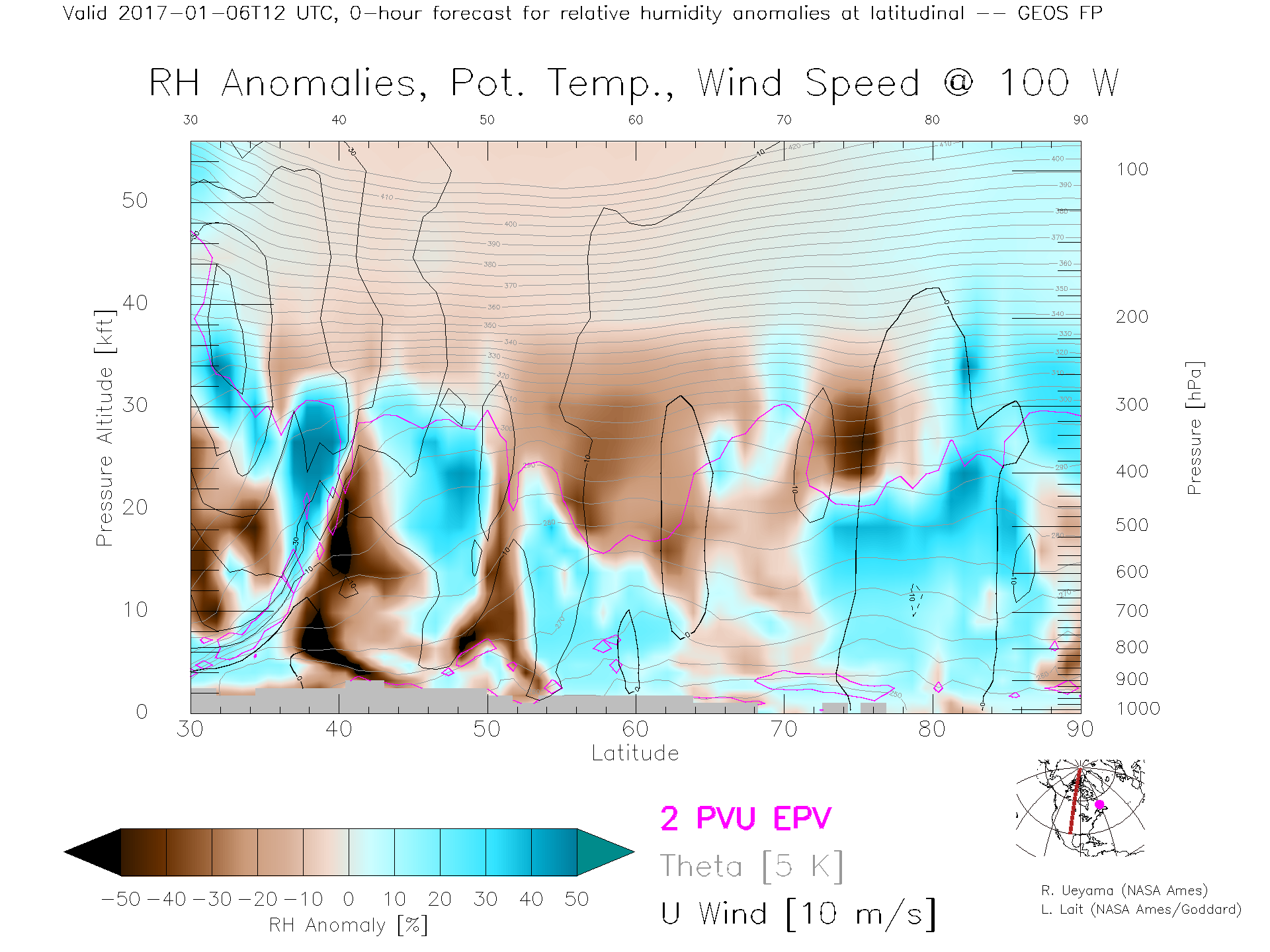 GEOS Forecast Rel. Hum. X-Section (100 W)