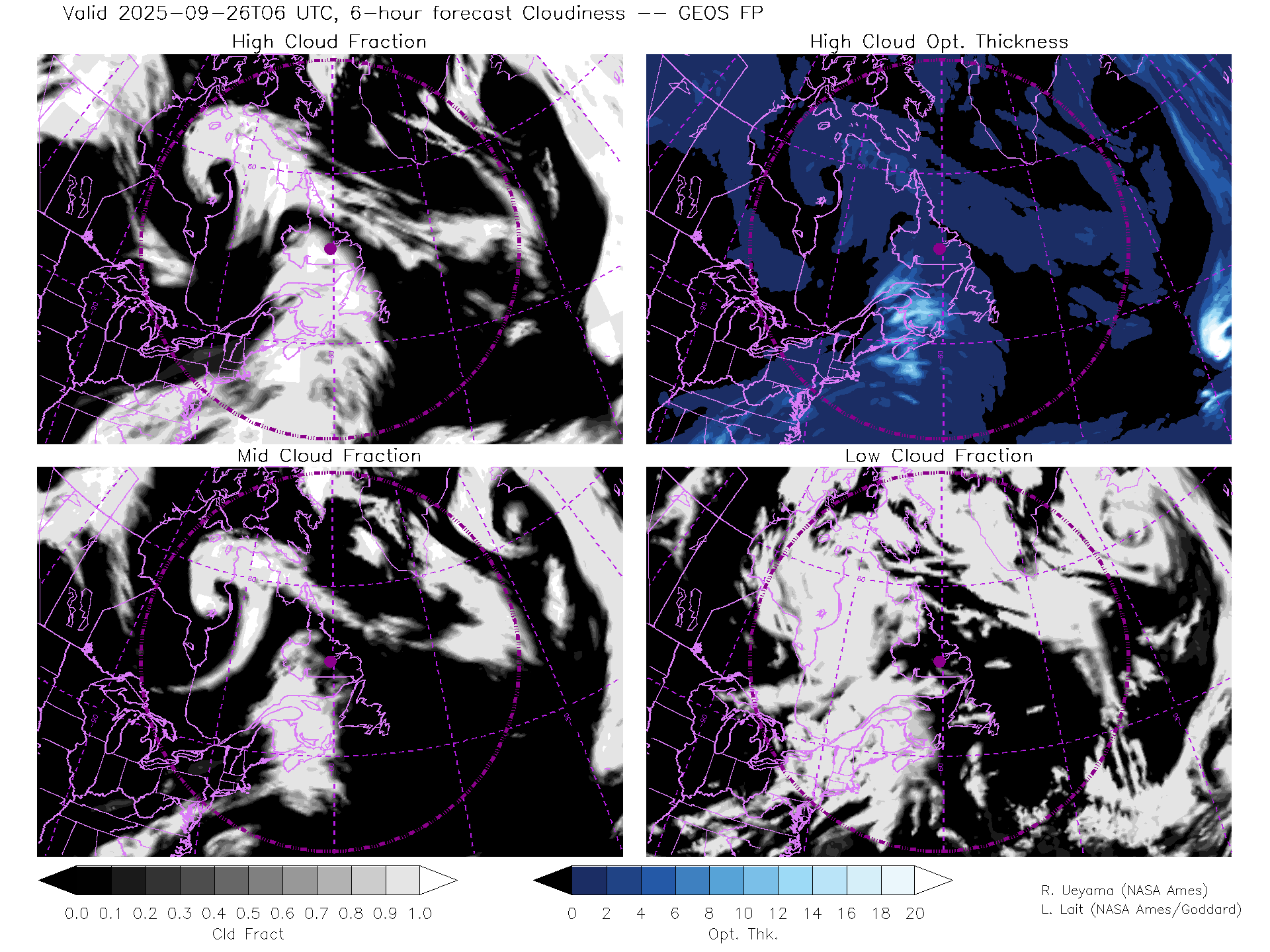 GEOS Forecast Cloud Fraction (High, Mid, Low) & High Cloud Optical Thickness