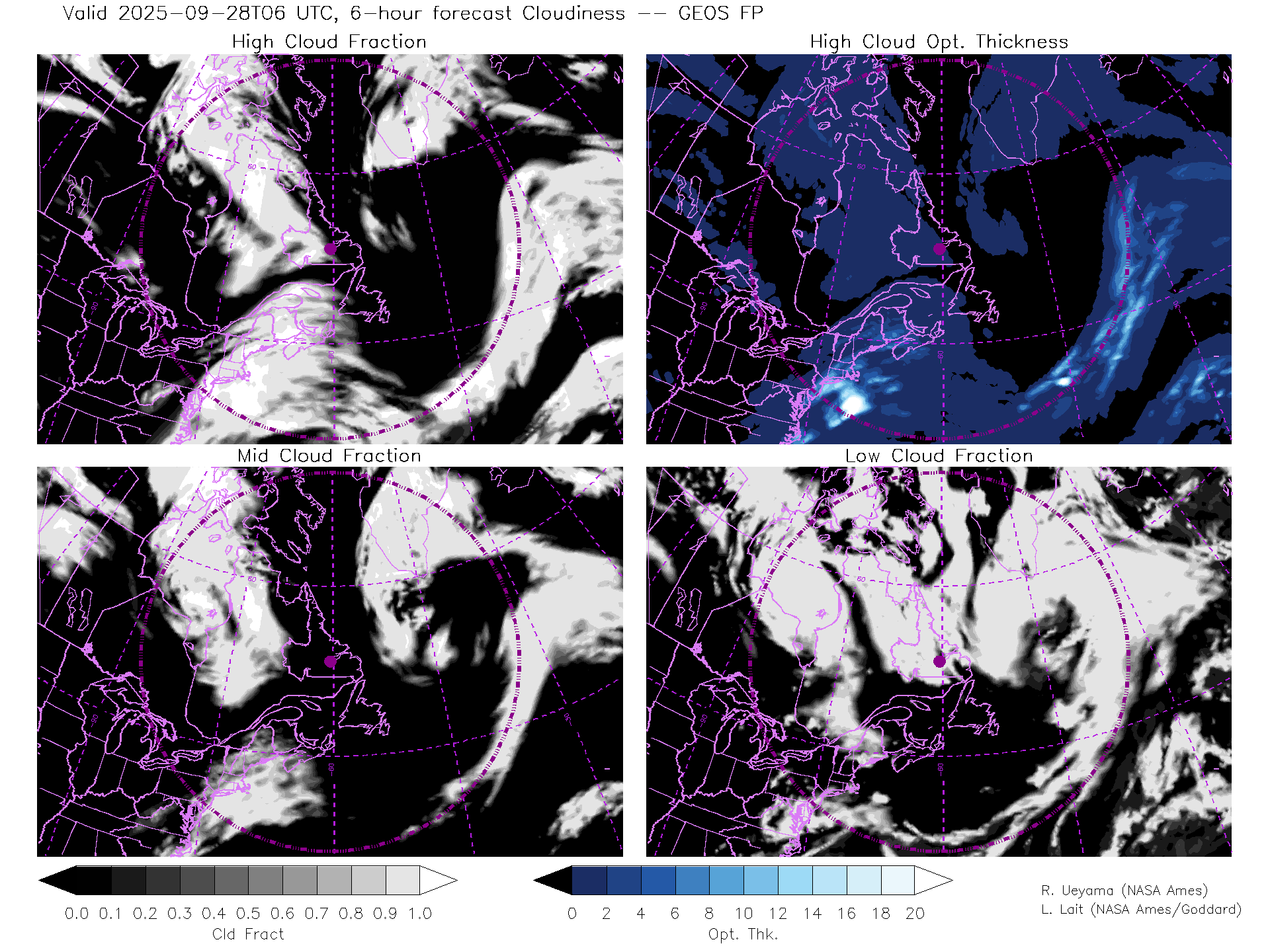 GEOS Forecast Cloud Fraction (High, Mid, Low) & High Cloud Optical Thickness