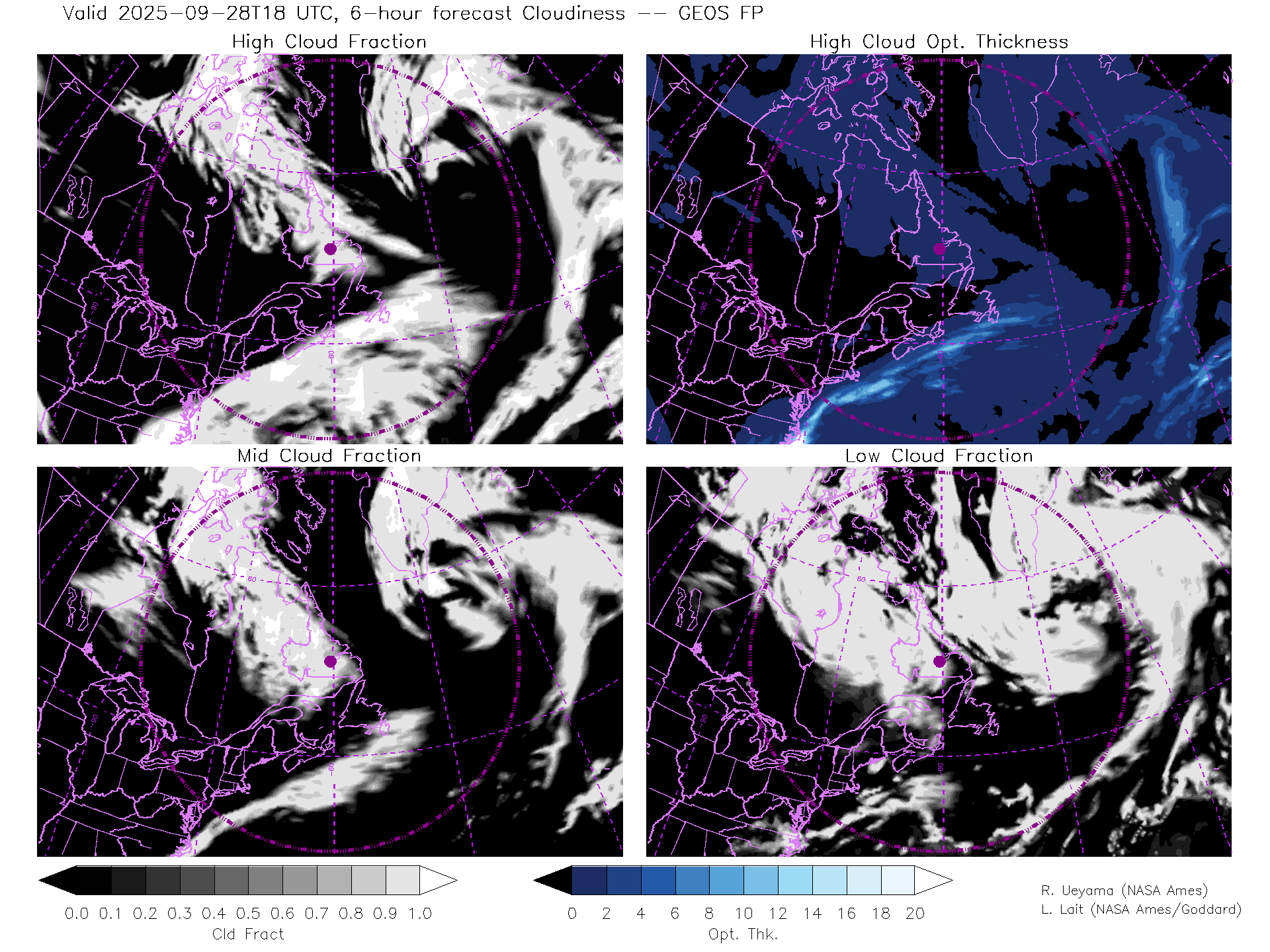 GEOS Forecast Cloud Fraction (High, Mid, Low) & High Cloud Optical Thickness
