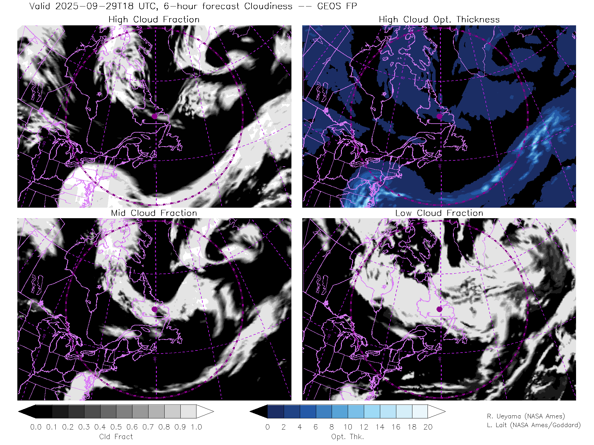 GEOS Forecast Cloud Fraction (High, Mid, Low) & High Cloud Optical Thickness