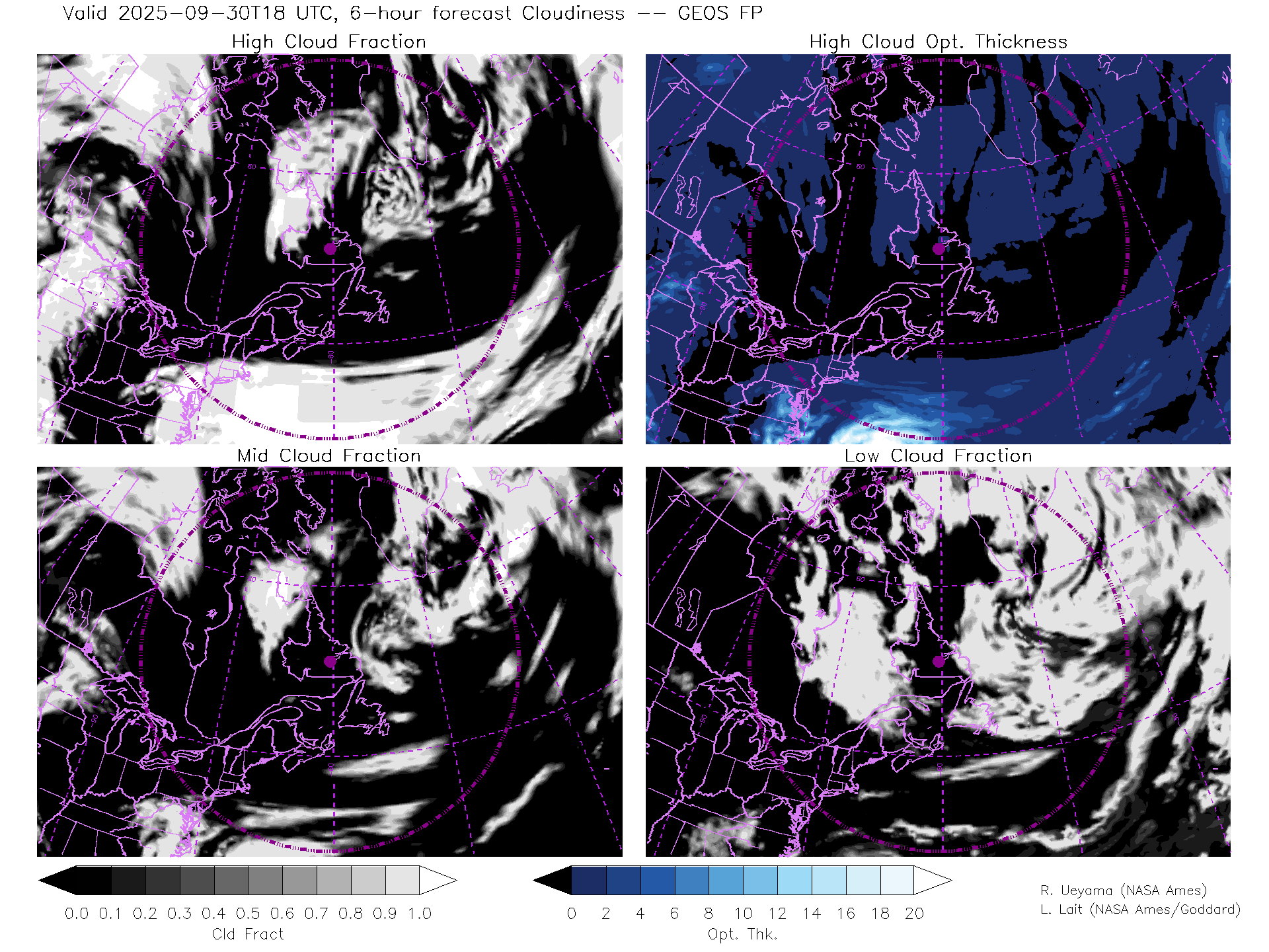 GEOS Forecast Cloud Fraction (High, Mid, Low) & High Cloud Optical Thickness