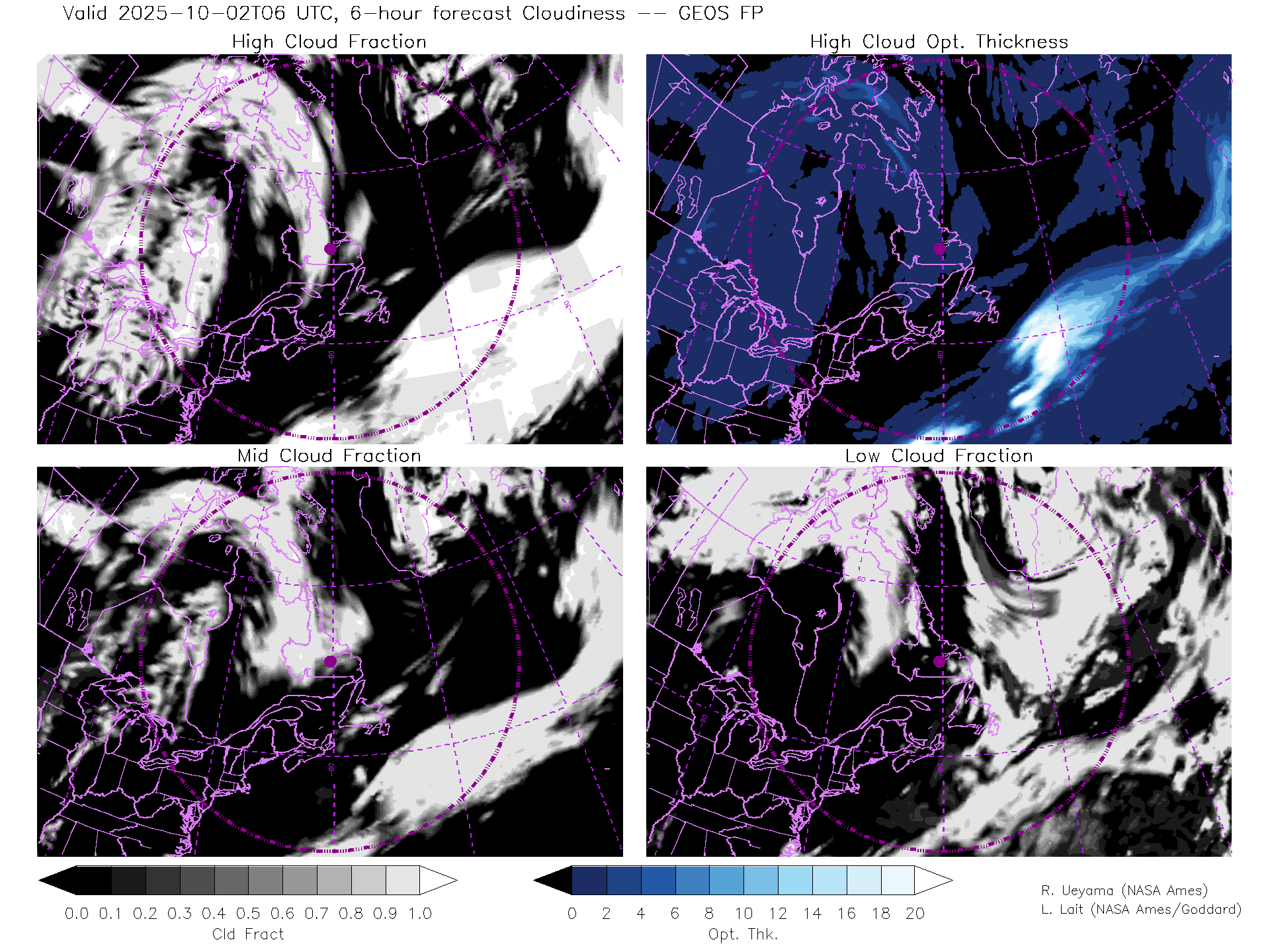 GEOS Forecast Cloud Fraction (High, Mid, Low) & High Cloud Optical Thickness