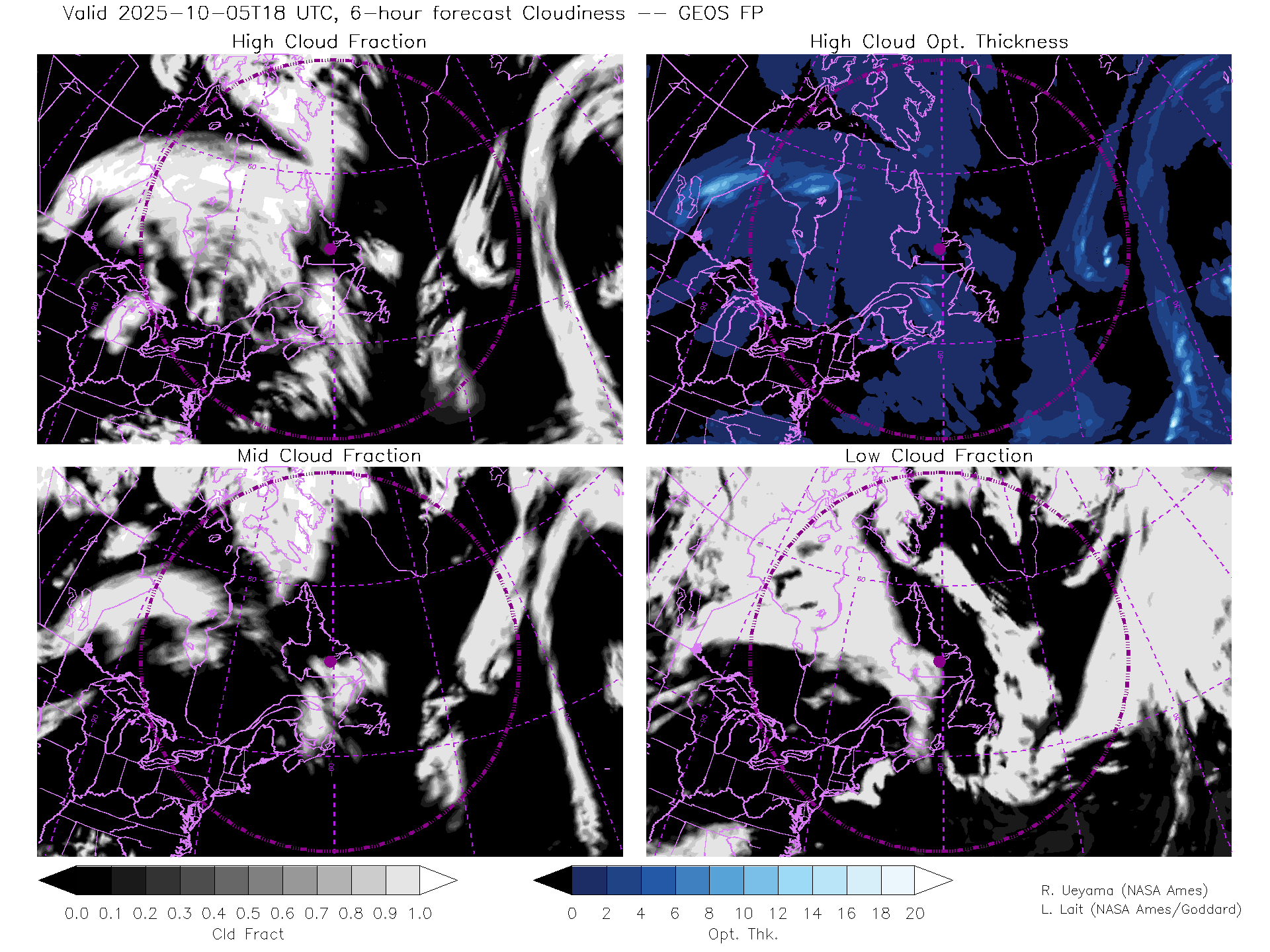 GEOS Forecast Cloud Fraction (High, Mid, Low) & High Cloud Optical Thickness