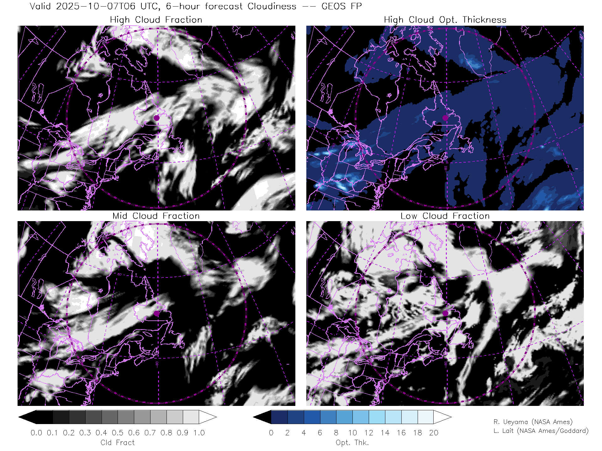 GEOS Forecast Cloud Fraction (High, Mid, Low) & High Cloud Optical Thickness