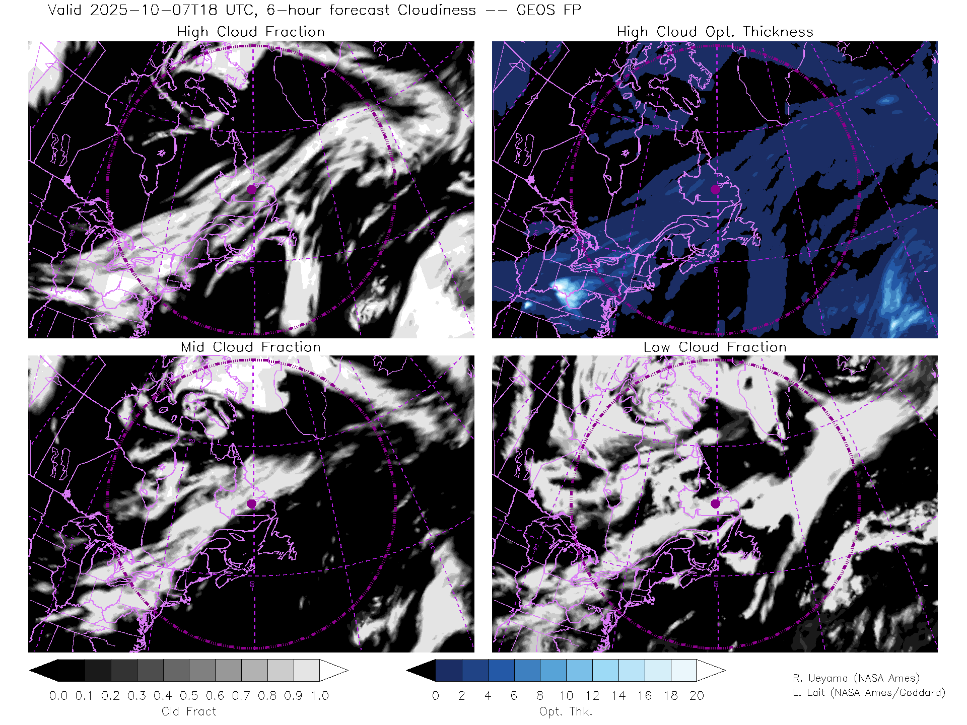 GEOS Forecast Cloud Fraction (High, Mid, Low) & High Cloud Optical Thickness