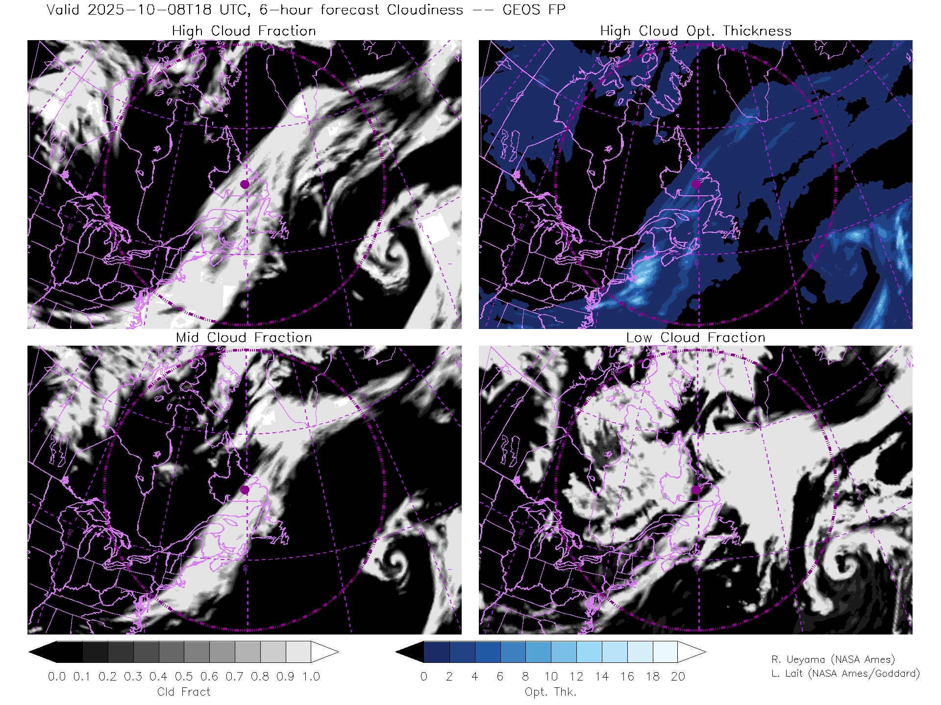 GEOS Forecast Cloud Fraction (High, Mid, Low) & High Cloud Optical Thickness