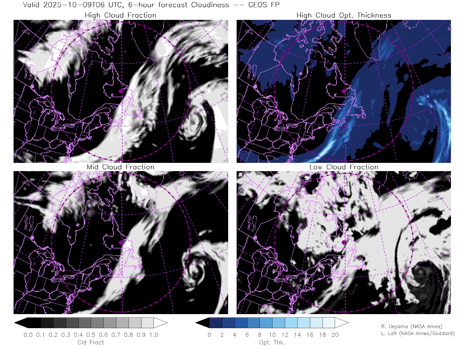 GEOS Forecast Cloud Fraction (High, Mid, Low) & High Cloud Optical Thickness