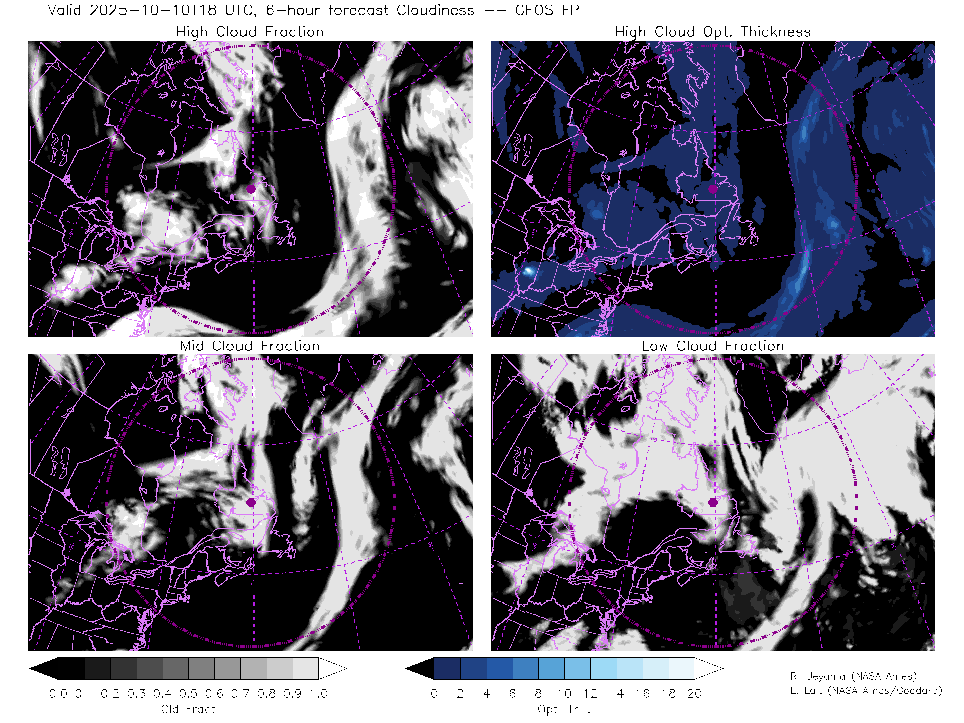 GEOS Forecast Cloud Fraction (High, Mid, Low) & High Cloud Optical Thickness