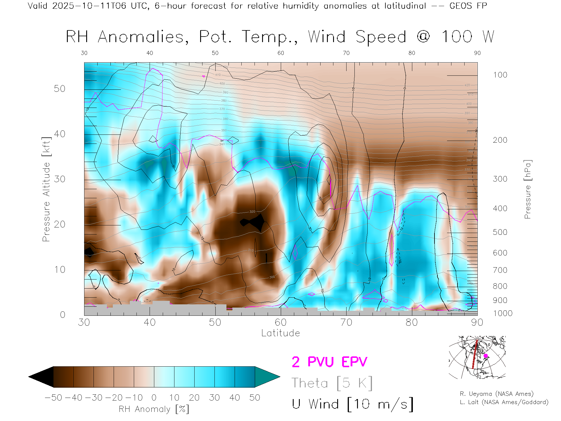GEOS Forecast Rel. Hum. X-Section (100 W)