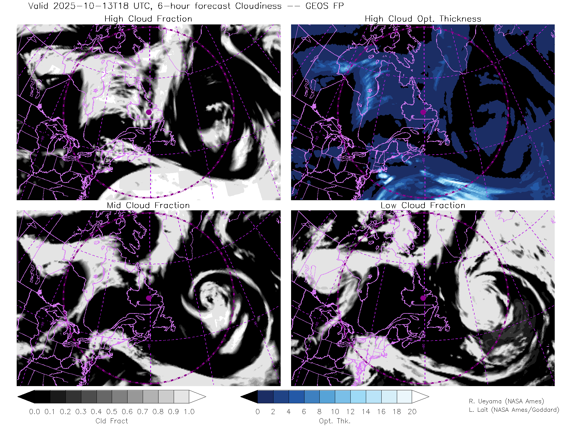 GEOS Forecast Cloud Fraction (High, Mid, Low) & High Cloud Optical Thickness
