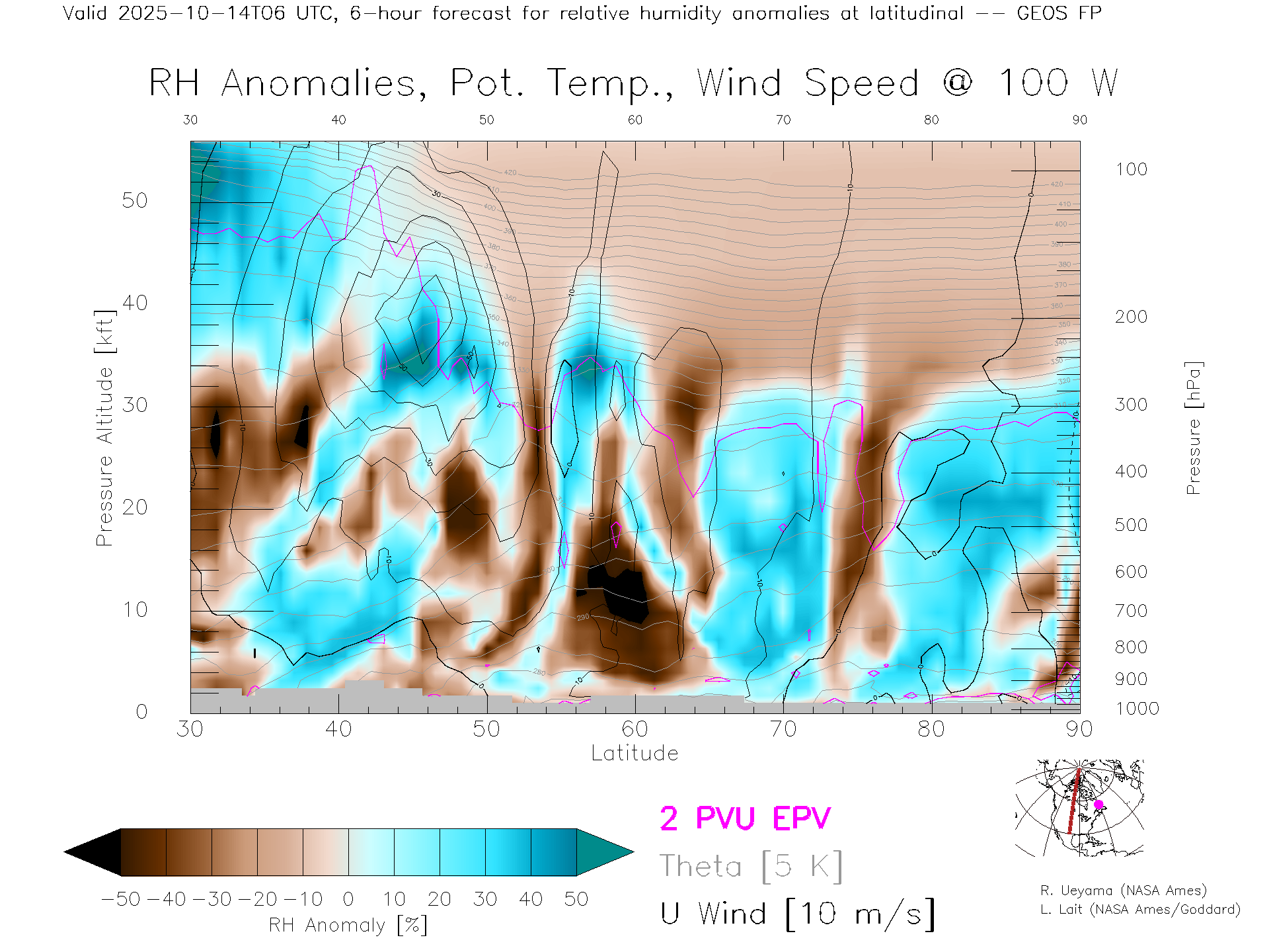 GEOS Forecast Rel. Hum. X-Section (100 W)