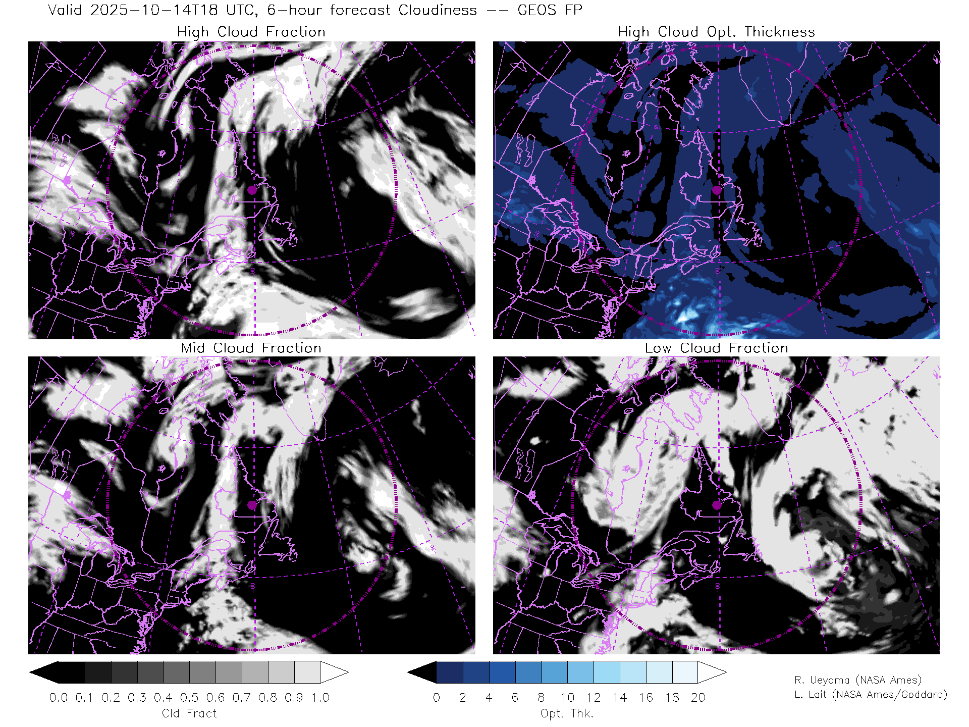GEOS Forecast Cloud Fraction (High, Mid, Low) & High Cloud Optical Thickness