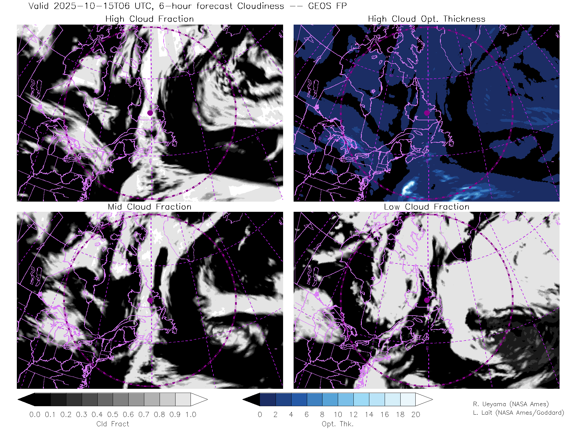 GEOS Forecast Cloud Fraction (High, Mid, Low) & High Cloud Optical Thickness