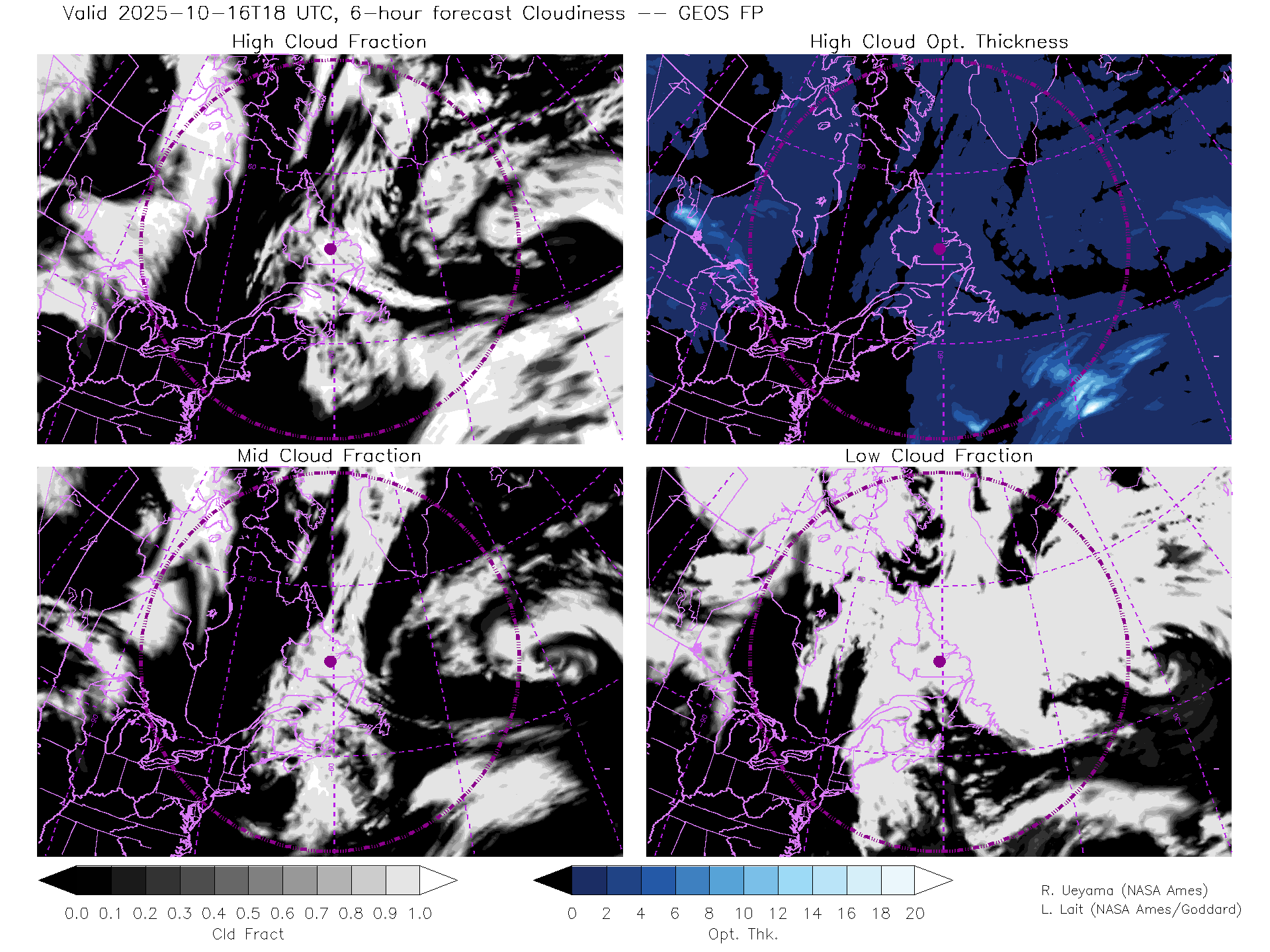 GEOS Forecast Cloud Fraction (High, Mid, Low) & High Cloud Optical Thickness