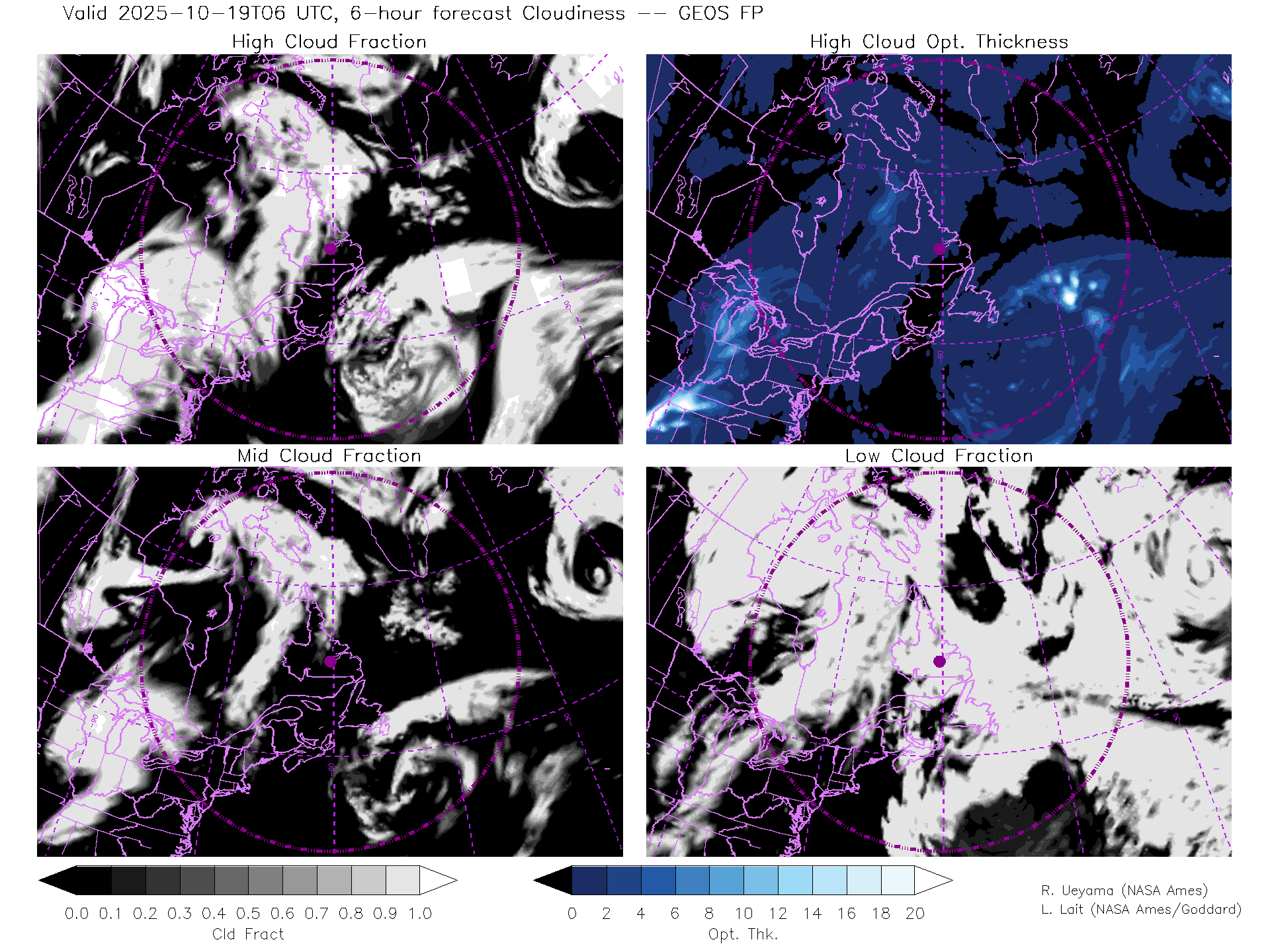 GEOS Forecast Cloud Fraction (High, Mid, Low) & High Cloud Optical Thickness
