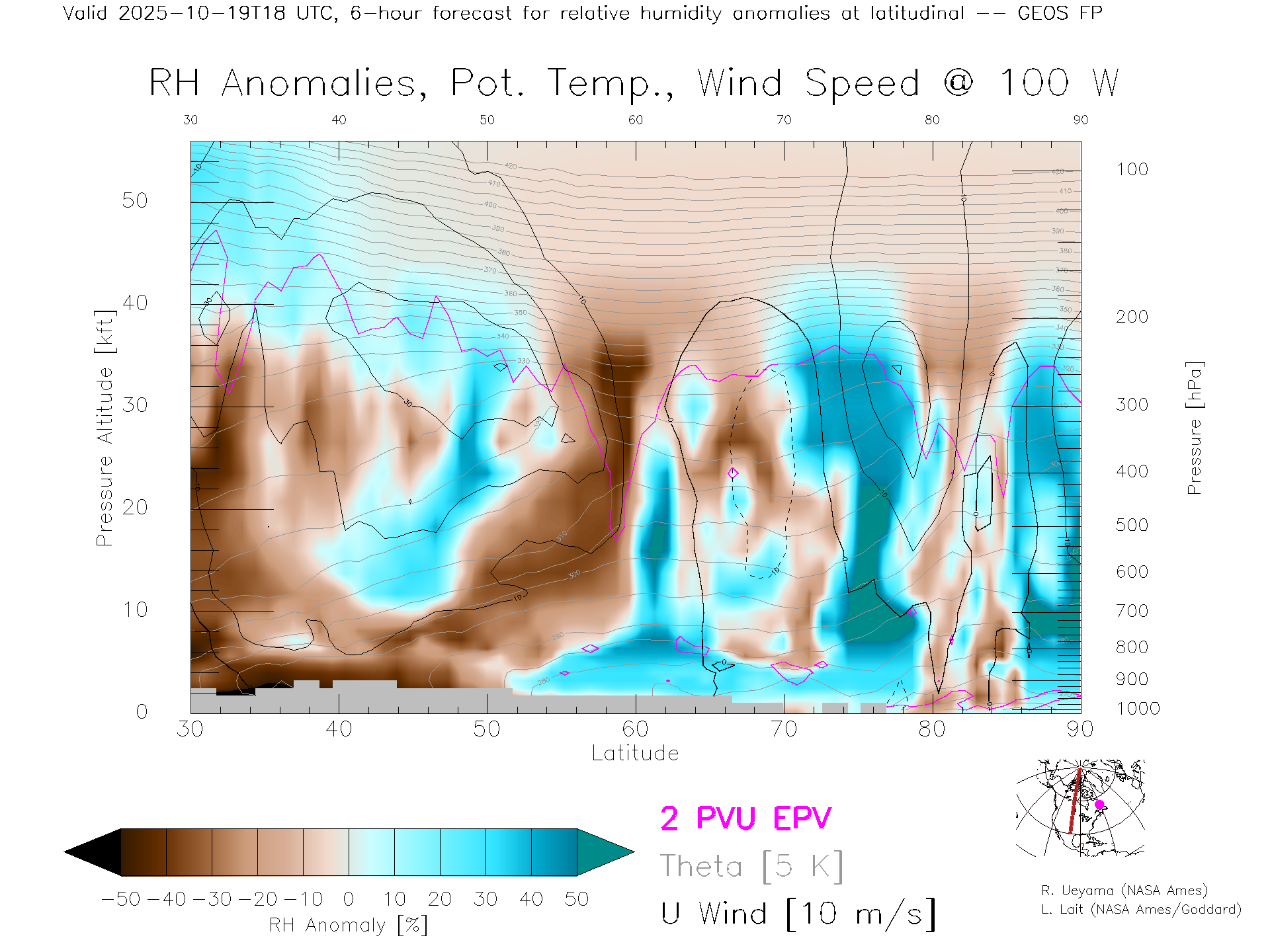 GEOS Forecast Rel. Hum. X-Section (100 W)