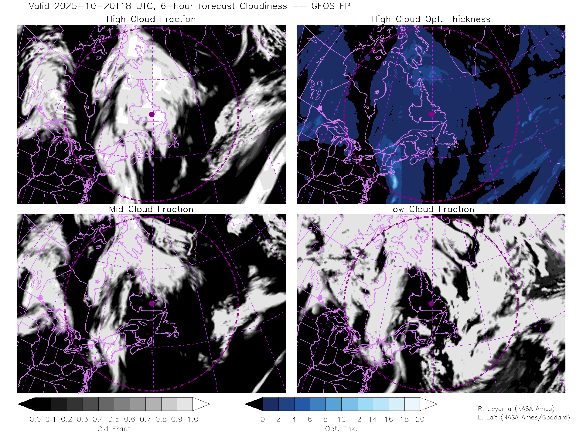 GEOS Forecast Cloud Fraction (High, Mid, Low) & High Cloud Optical Thickness