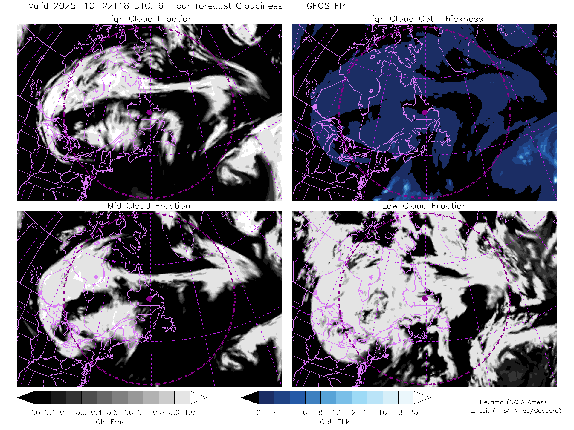GEOS Forecast Cloud Fraction (High, Mid, Low) & High Cloud Optical Thickness