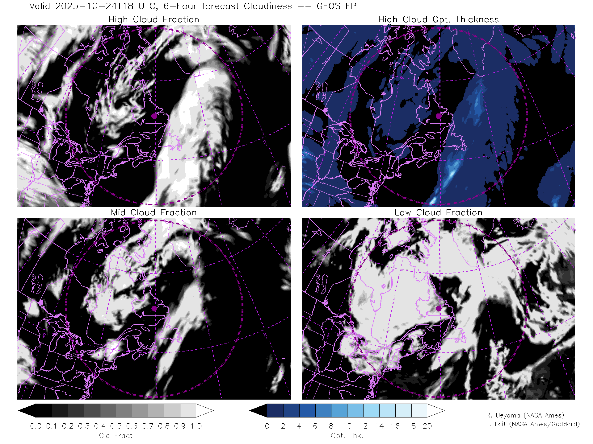 GEOS Forecast Cloud Fraction (High, Mid, Low) & High Cloud Optical Thickness
