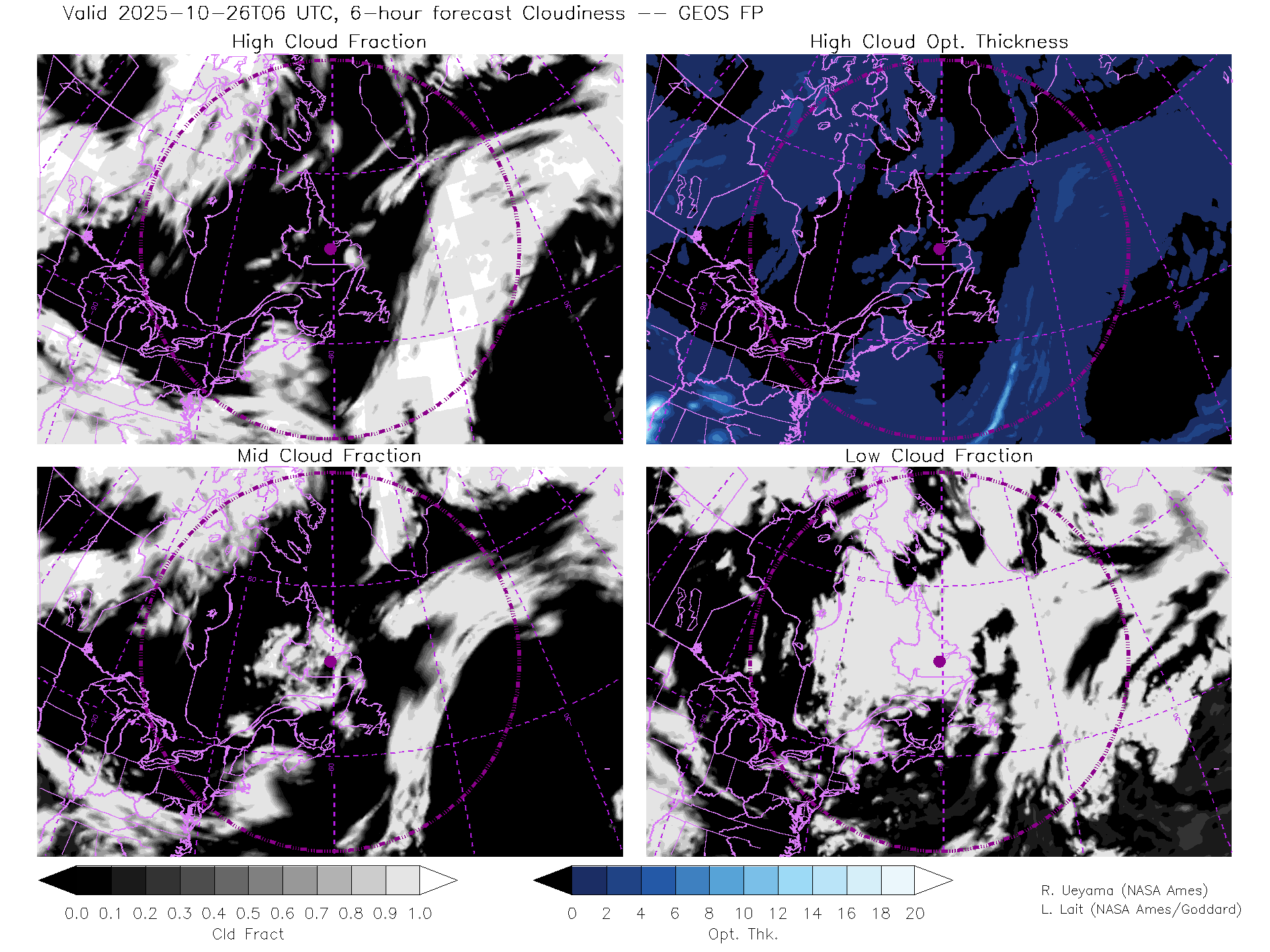 GEOS Forecast Cloud Fraction (High, Mid, Low) & High Cloud Optical Thickness