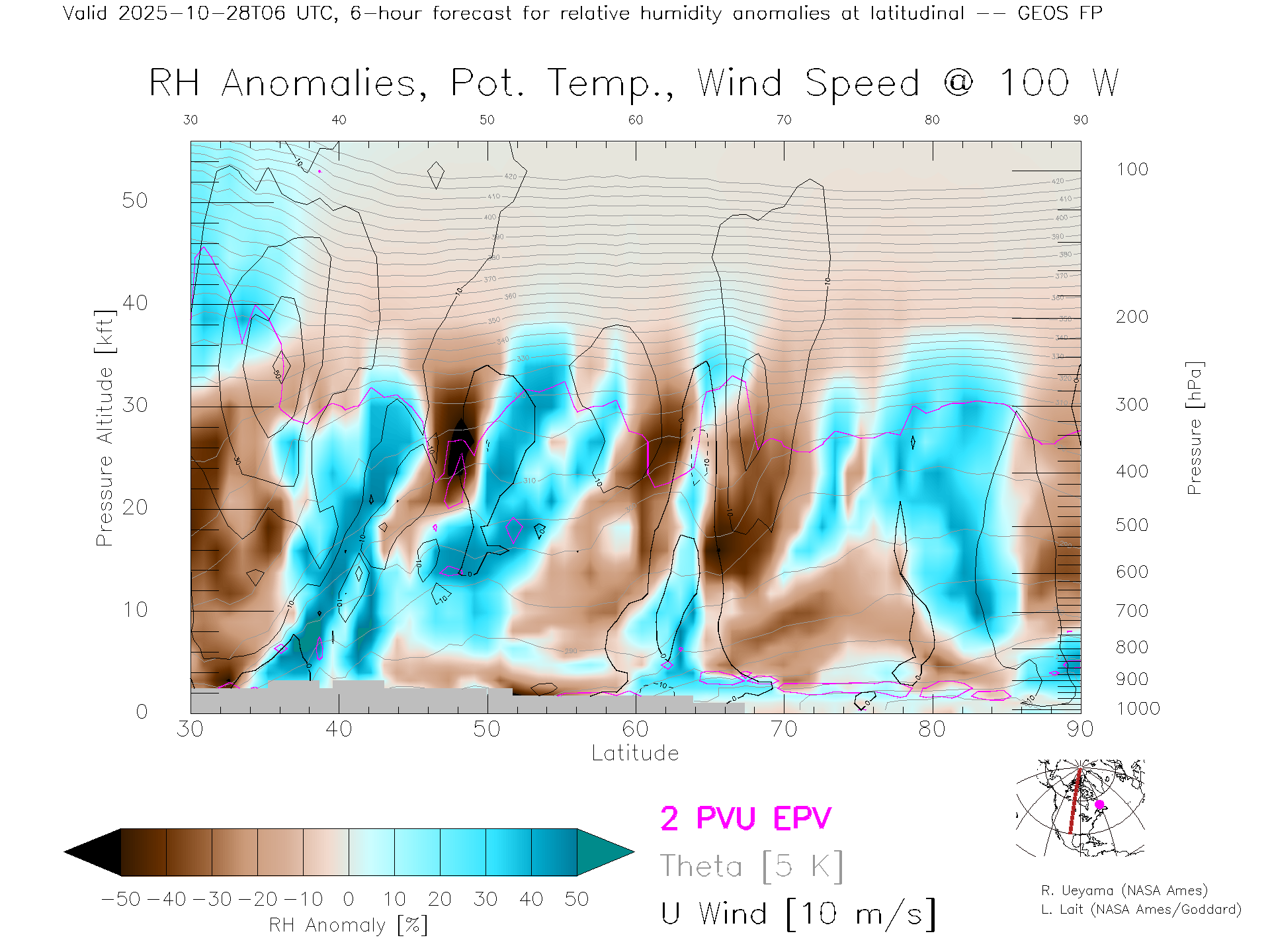 GEOS Forecast Rel. Hum. X-Section (100 W)
