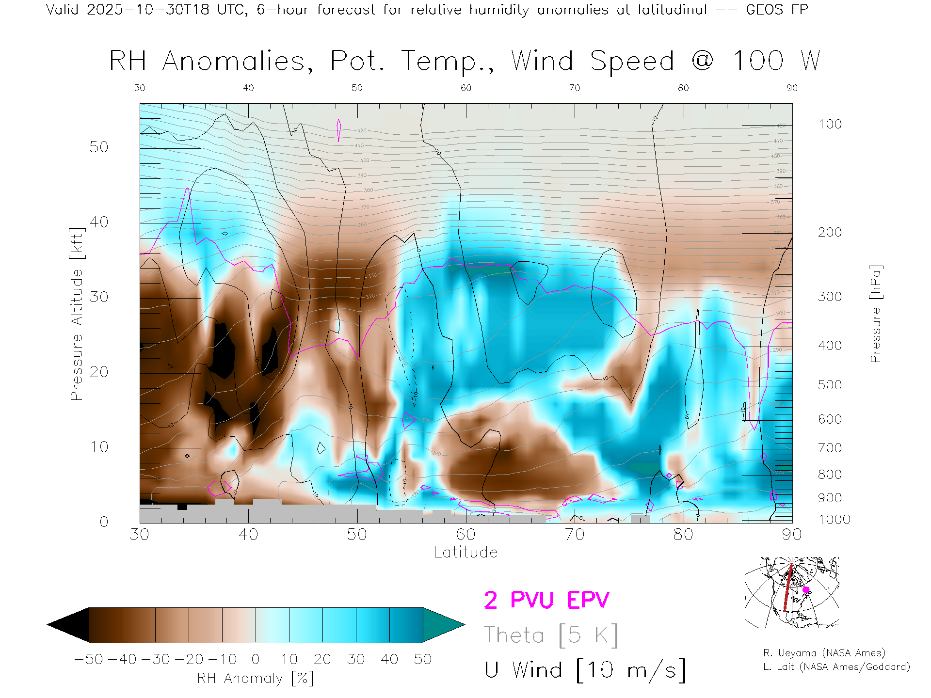 GEOS Forecast Rel. Hum. X-Section (100 W)