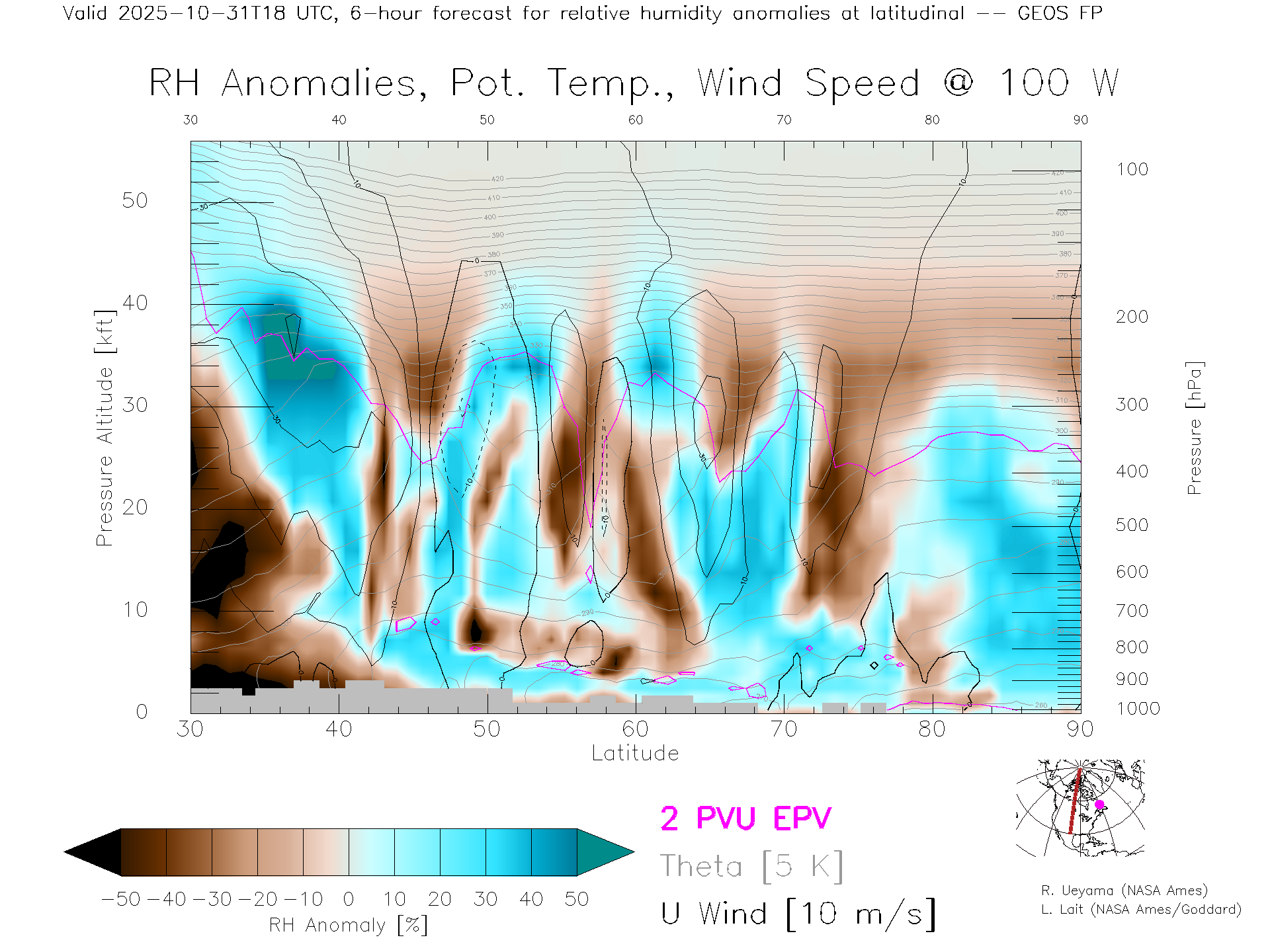 GEOS Forecast Rel. Hum. X-Section (100 W)