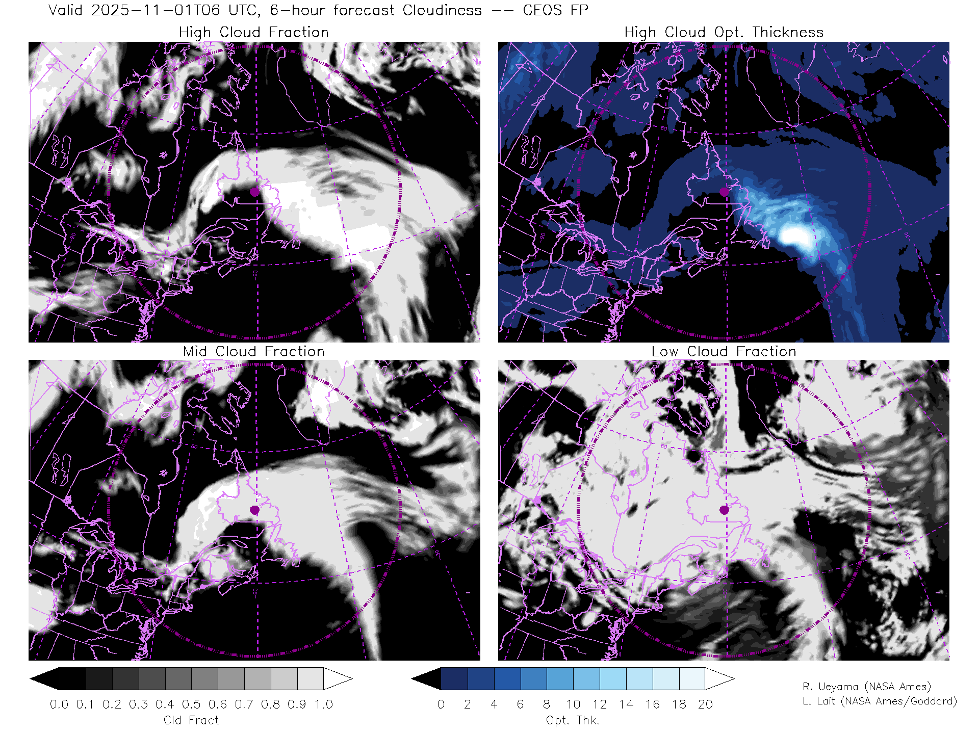 GEOS Forecast Cloud Fraction (High, Mid, Low) & High Cloud Optical Thickness