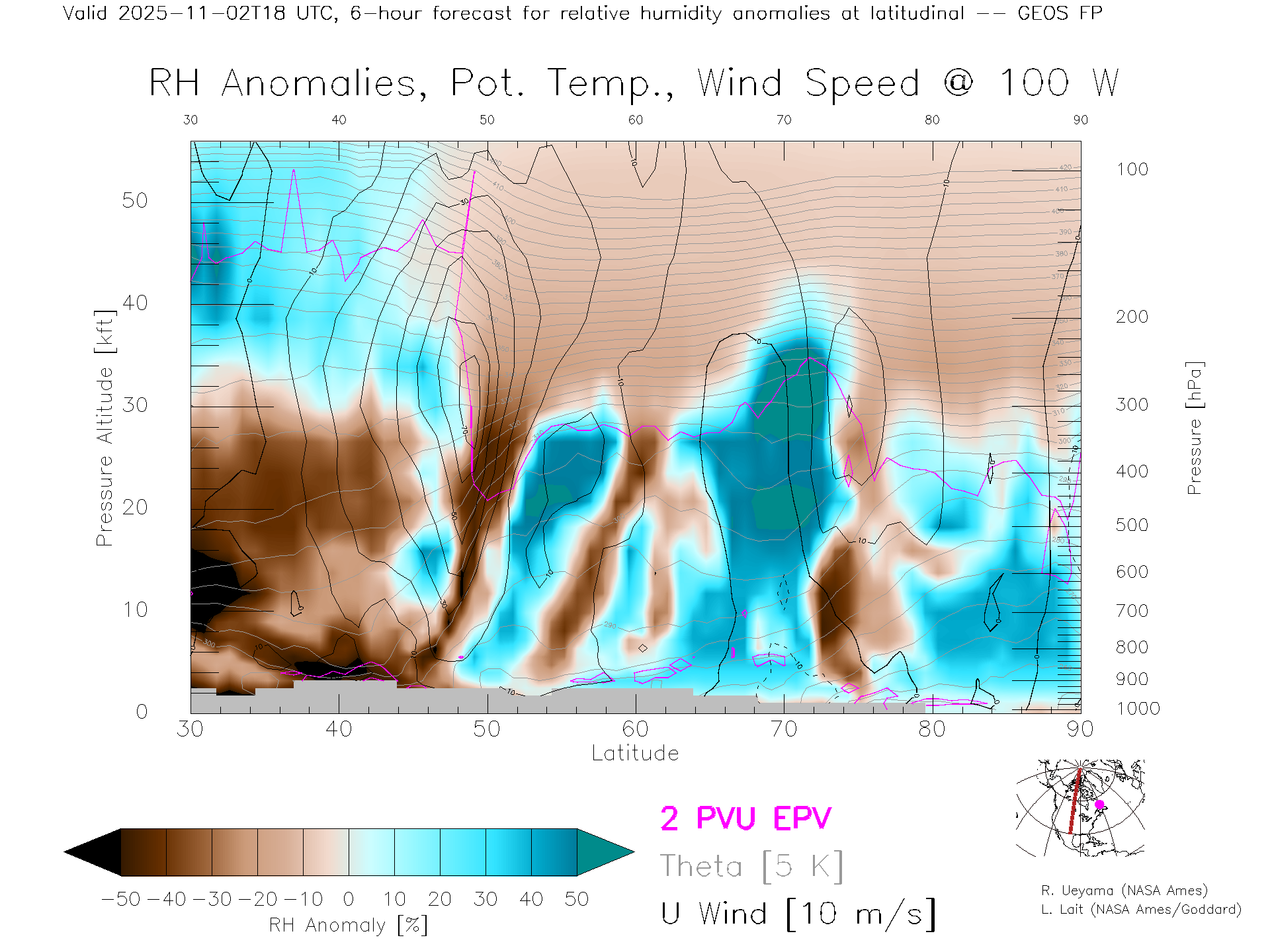 GEOS Forecast Rel. Hum. X-Section (100 W)
