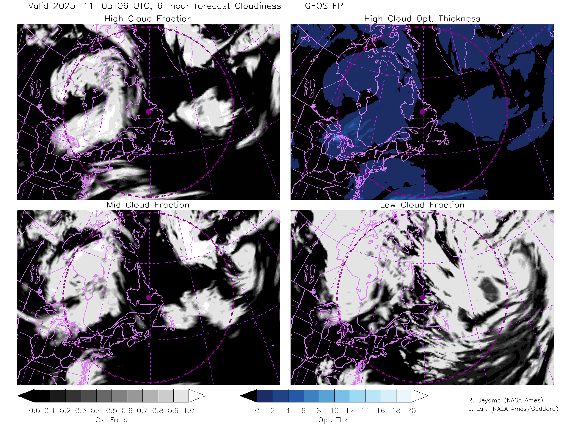 GEOS Forecast Cloud Fraction (High, Mid, Low) & High Cloud Optical Thickness