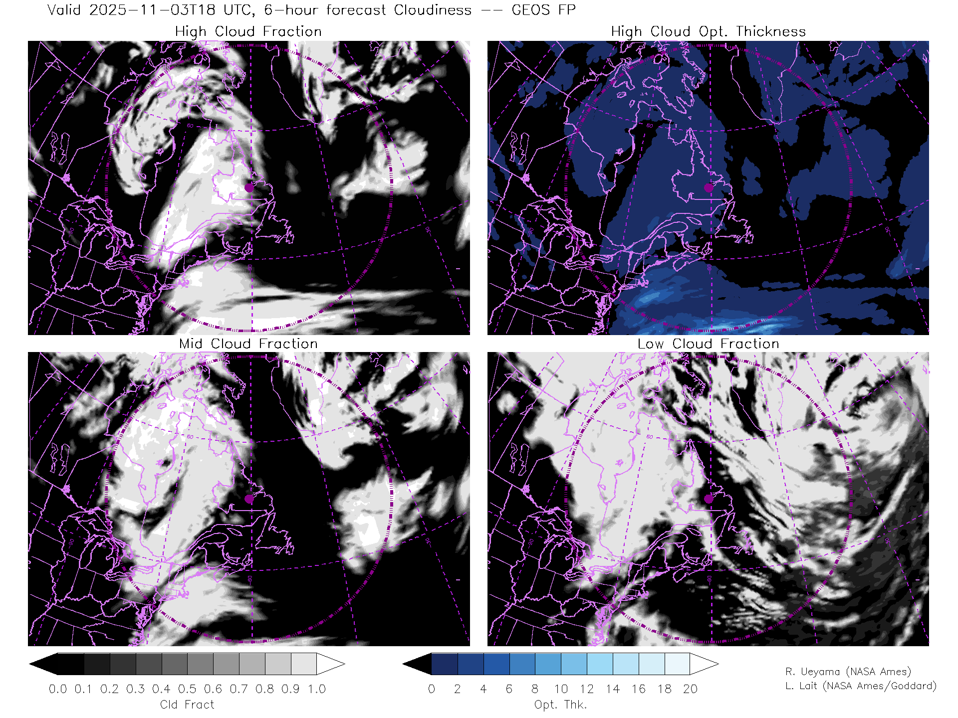 GEOS Forecast Cloud Fraction (High, Mid, Low) & High Cloud Optical Thickness