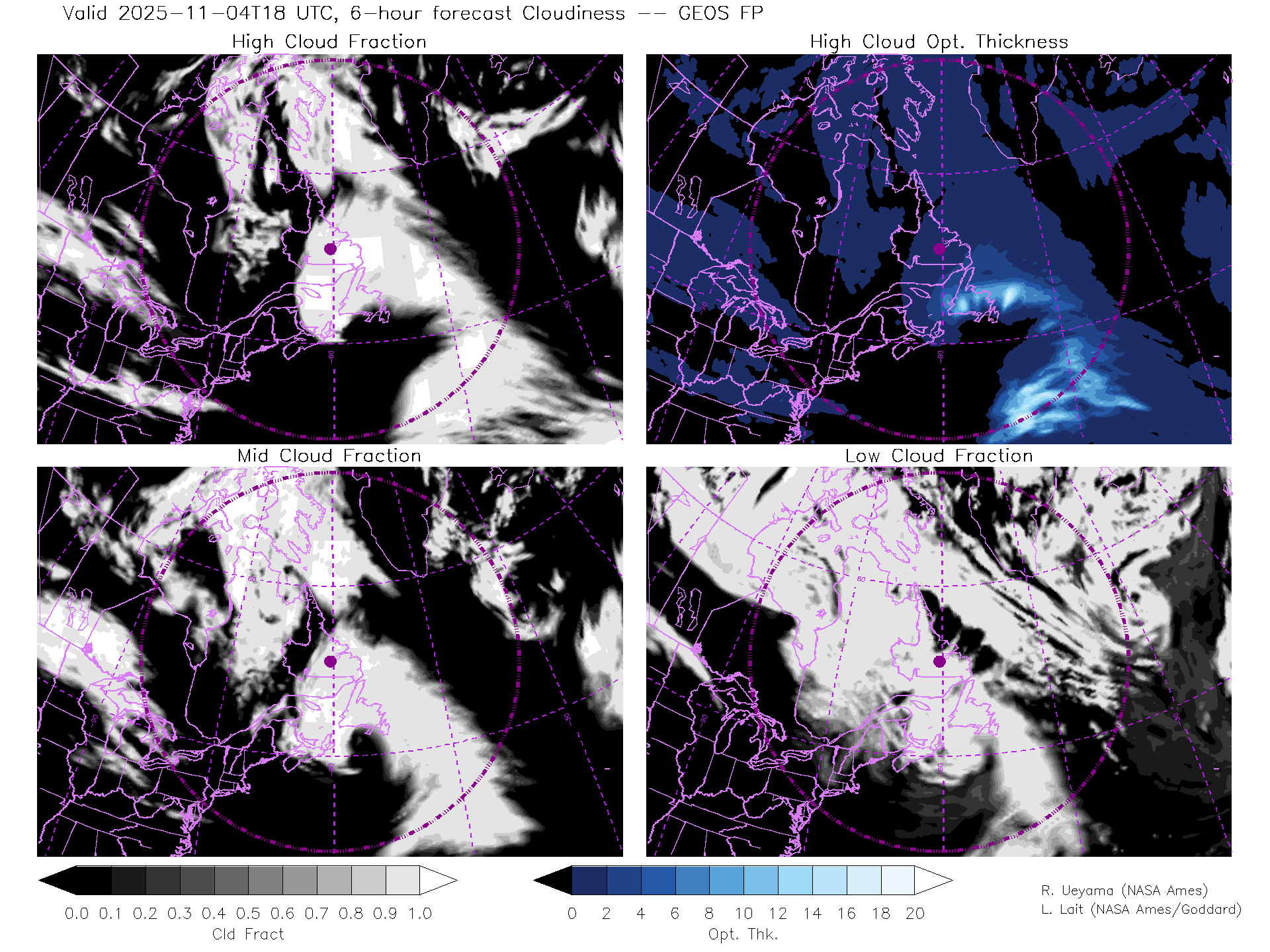 GEOS Forecast Cloud Fraction (High, Mid, Low) & High Cloud Optical Thickness