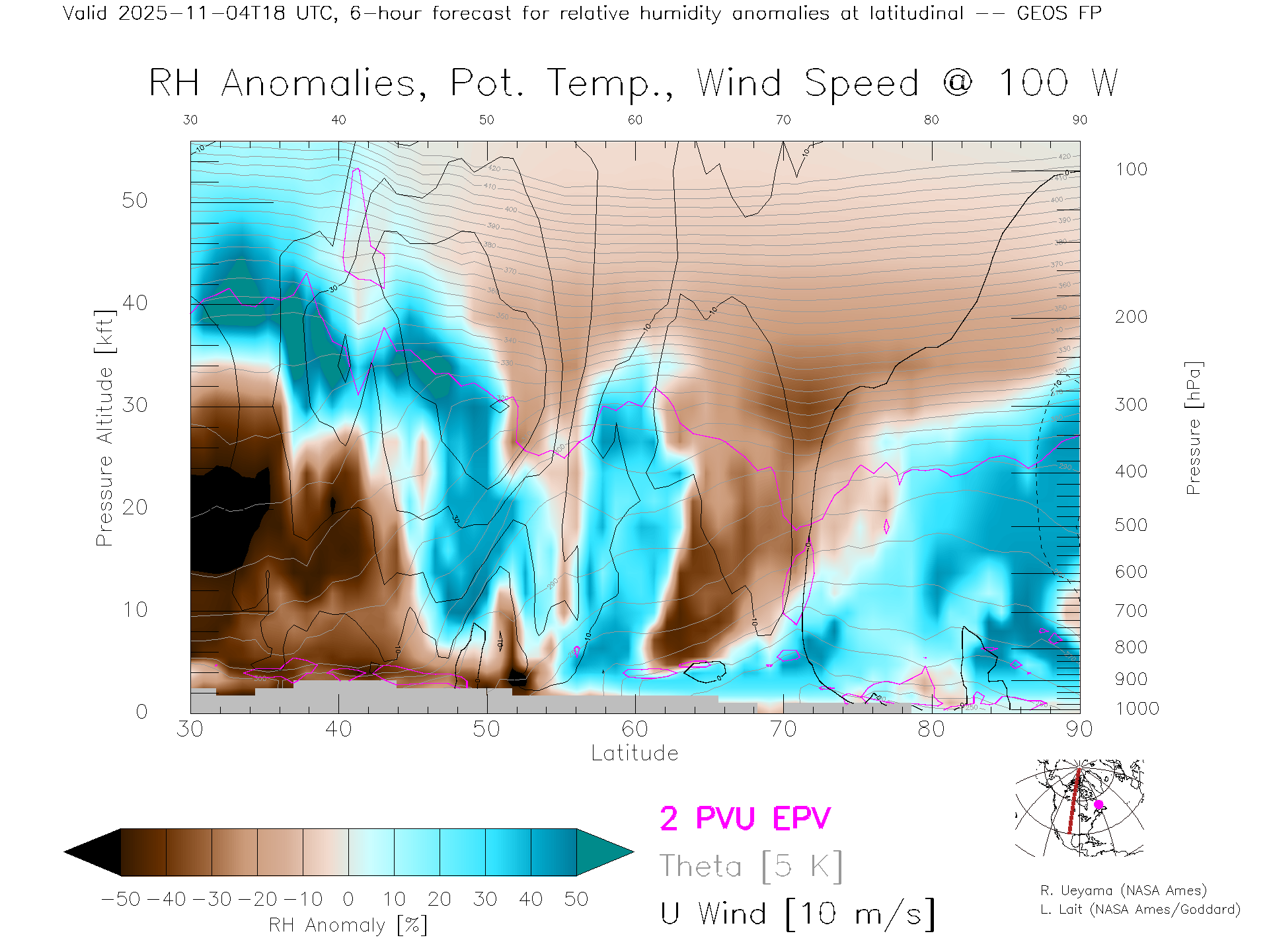 GEOS Forecast Rel. Hum. X-Section (100 W)