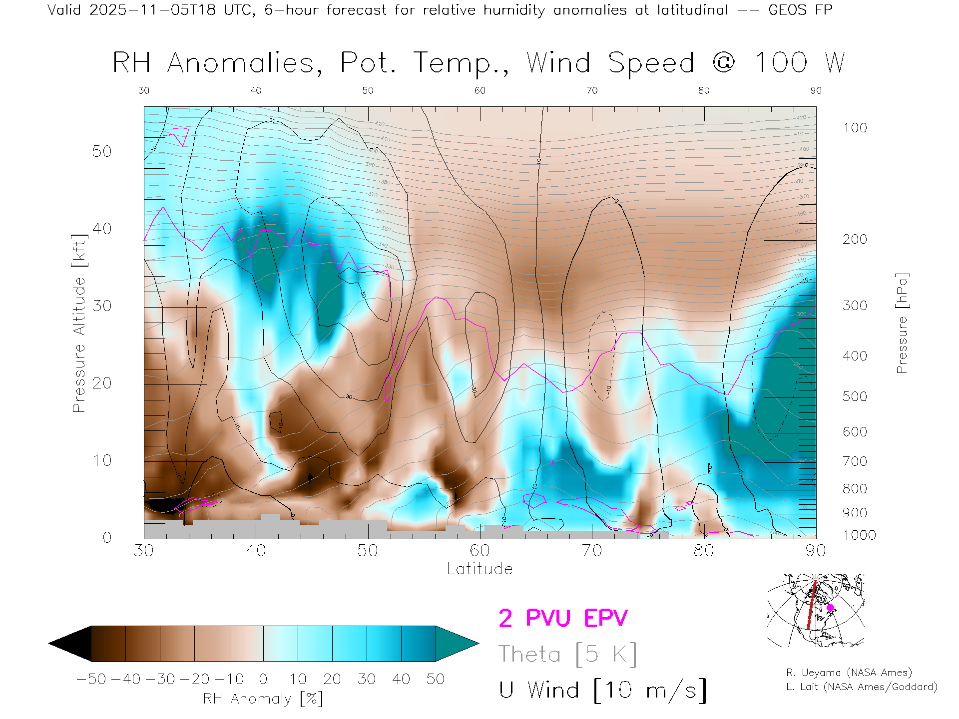 GEOS Forecast Rel. Hum. X-Section (100 W)