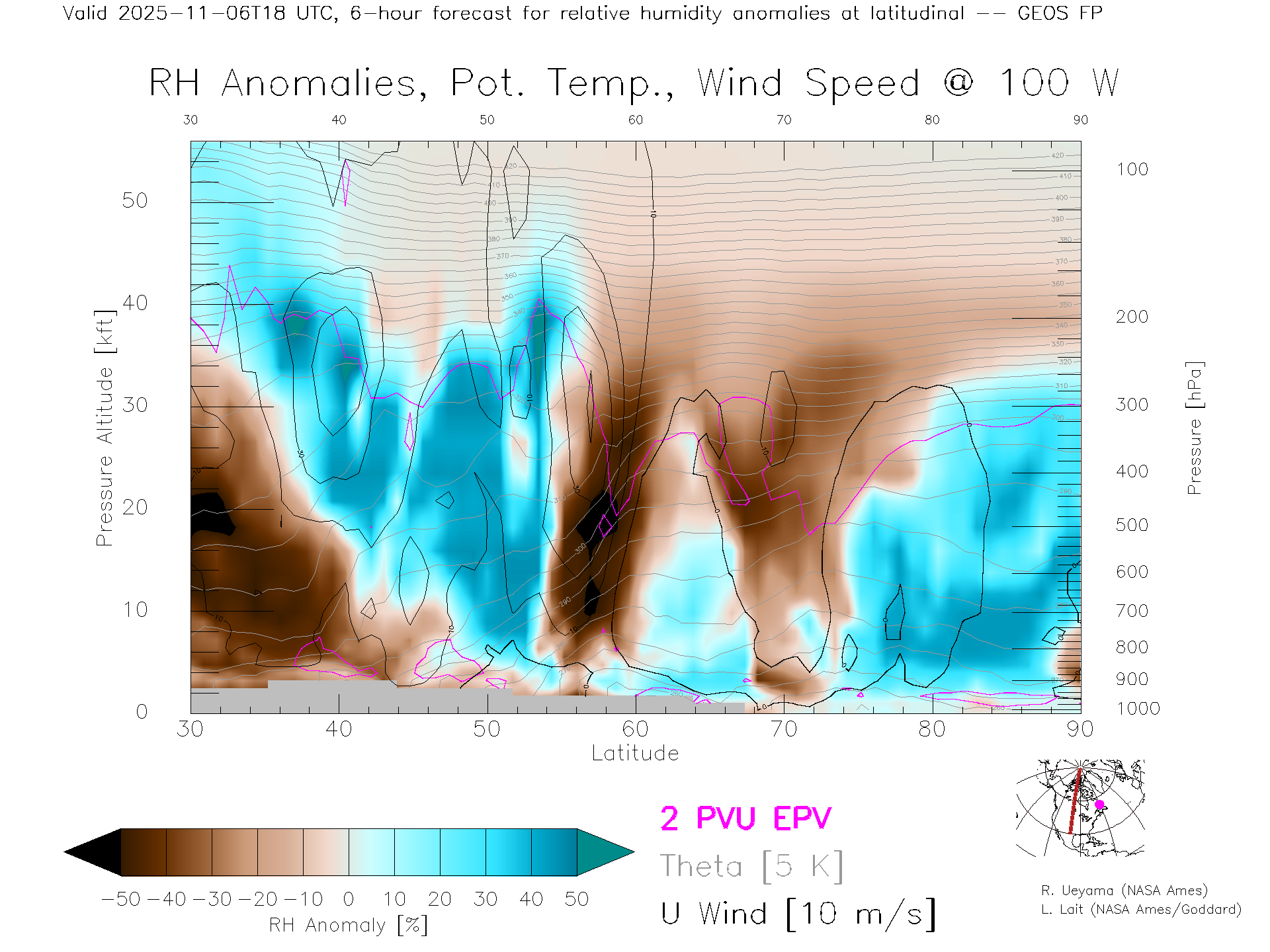 GEOS Forecast Rel. Hum. X-Section (100 W)
