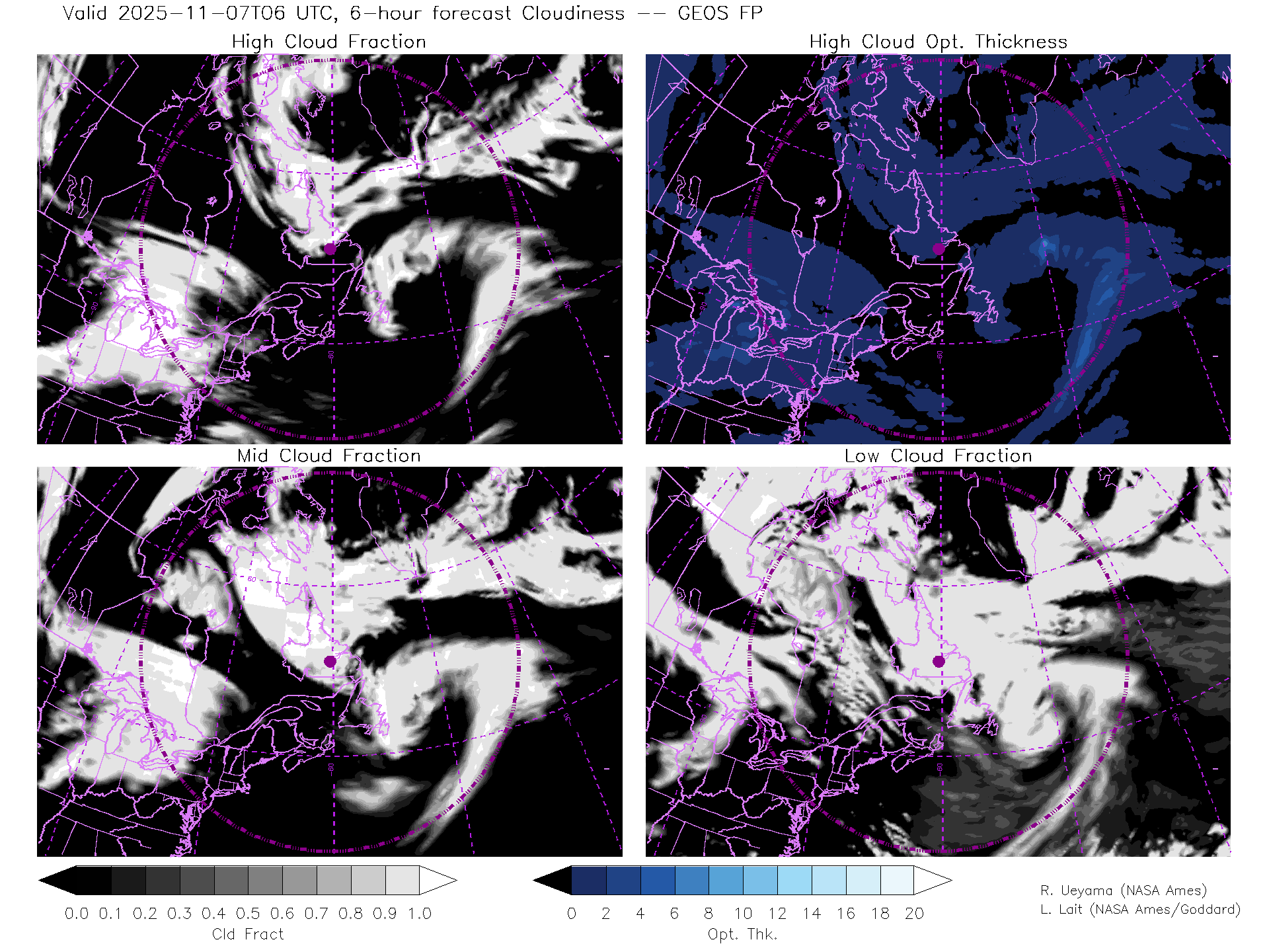 GEOS Forecast Cloud Fraction (High, Mid, Low) & High Cloud Optical Thickness