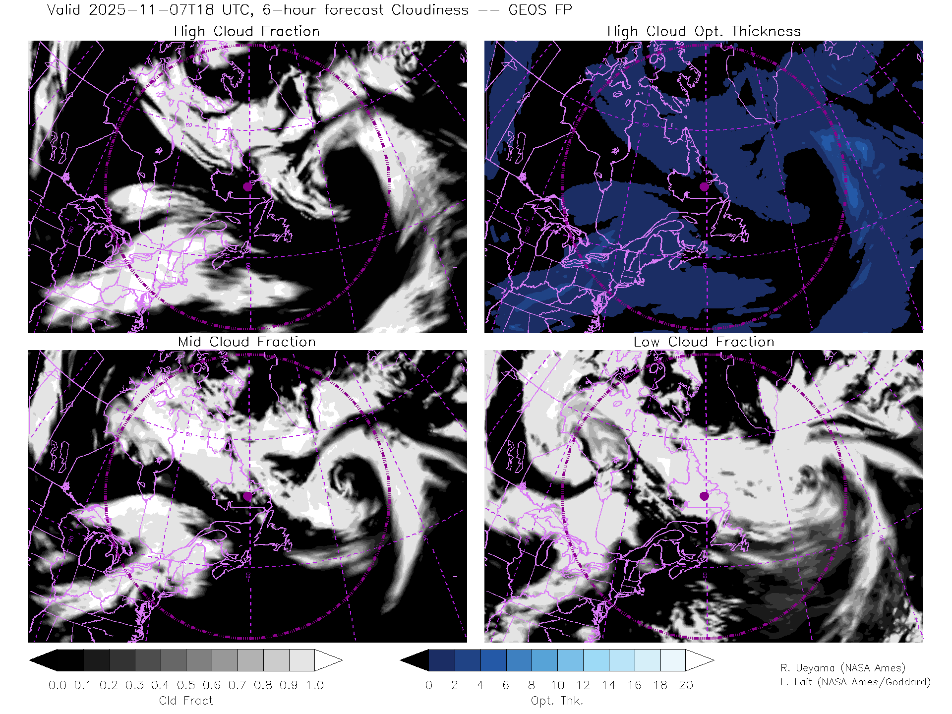 GEOS Forecast Cloud Fraction (High, Mid, Low) & High Cloud Optical Thickness