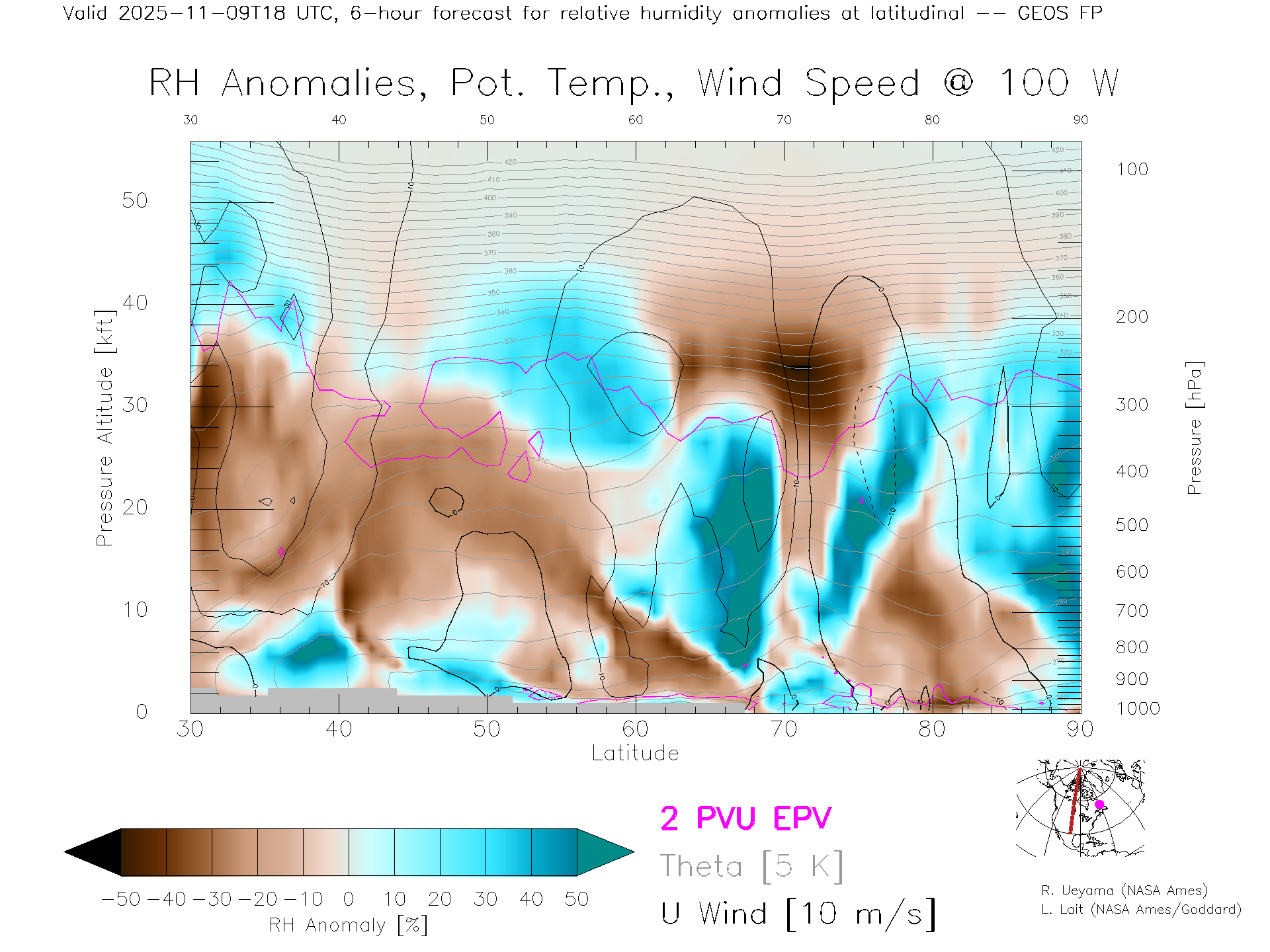 GEOS Forecast Rel. Hum. X-Section (100 W)