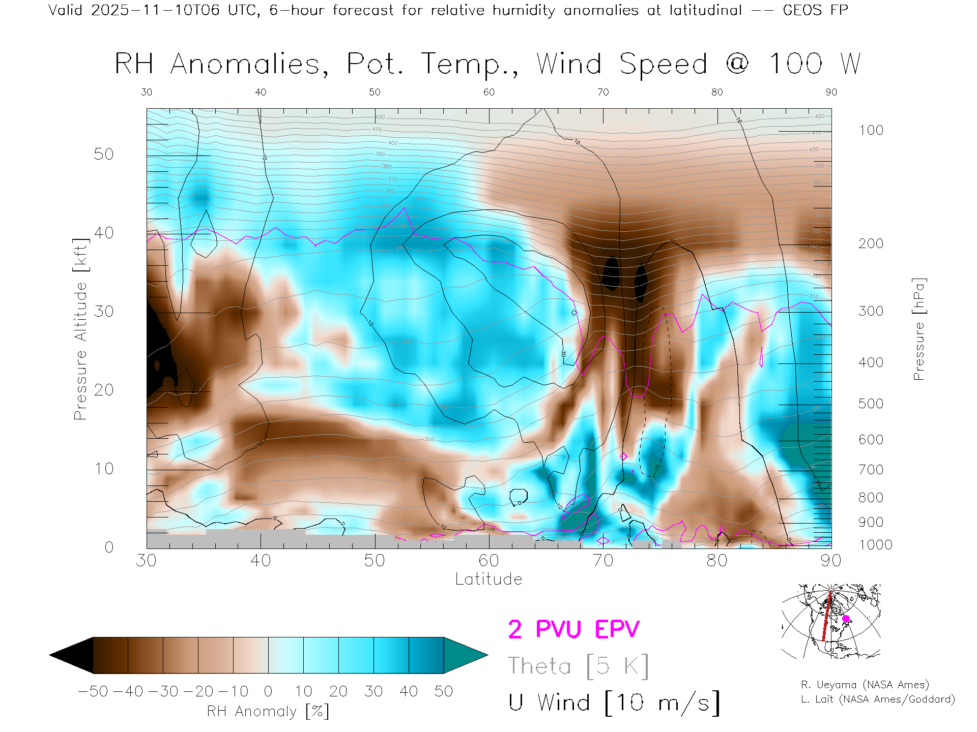 GEOS Forecast Rel. Hum. X-Section (100 W)