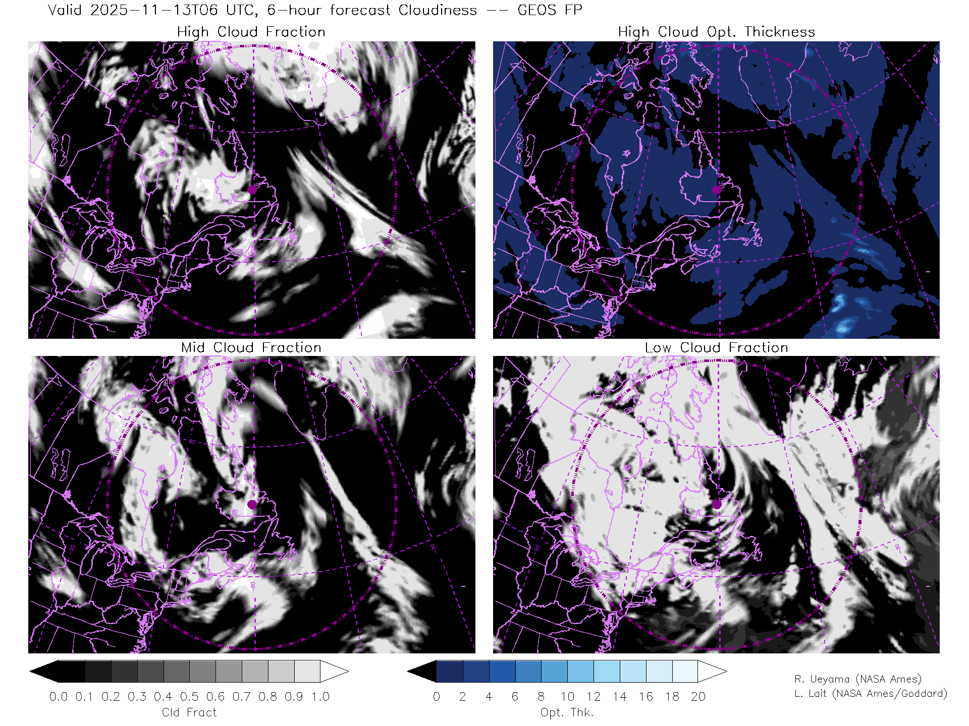 GEOS Forecast Cloud Fraction (High, Mid, Low) & High Cloud Optical Thickness