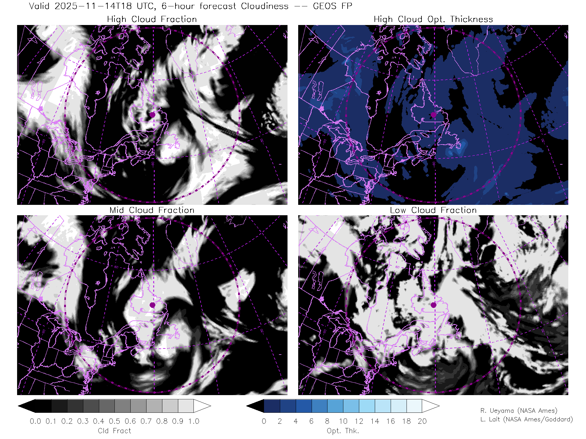 GEOS Forecast Cloud Fraction (High, Mid, Low) & High Cloud Optical Thickness