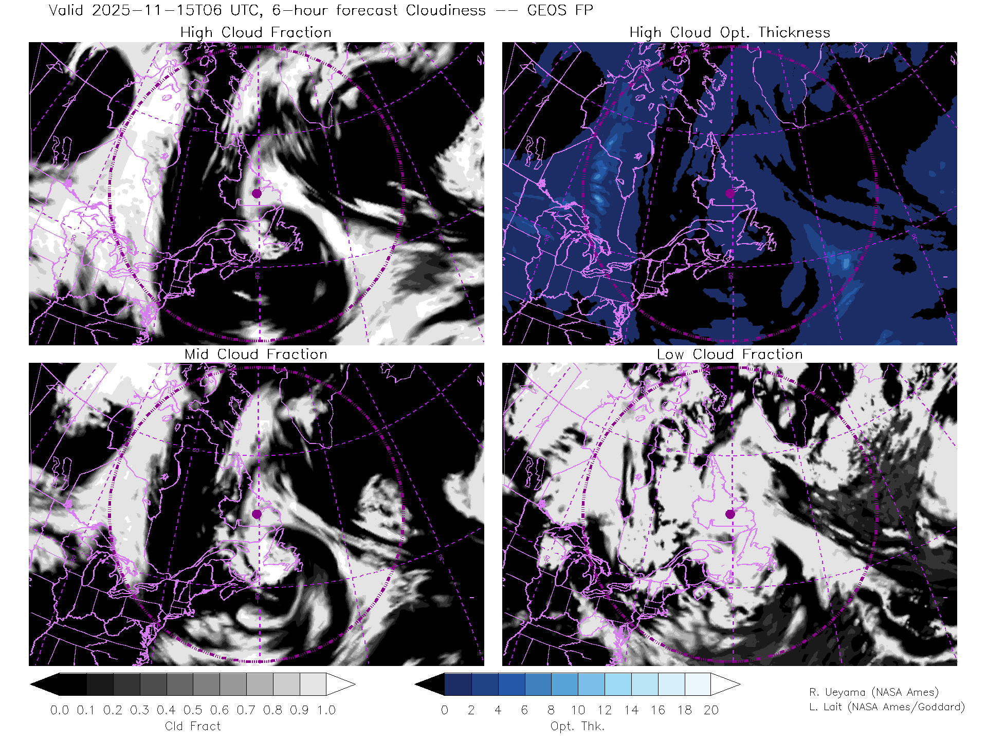 GEOS Forecast Cloud Fraction (High, Mid, Low) & High Cloud Optical Thickness