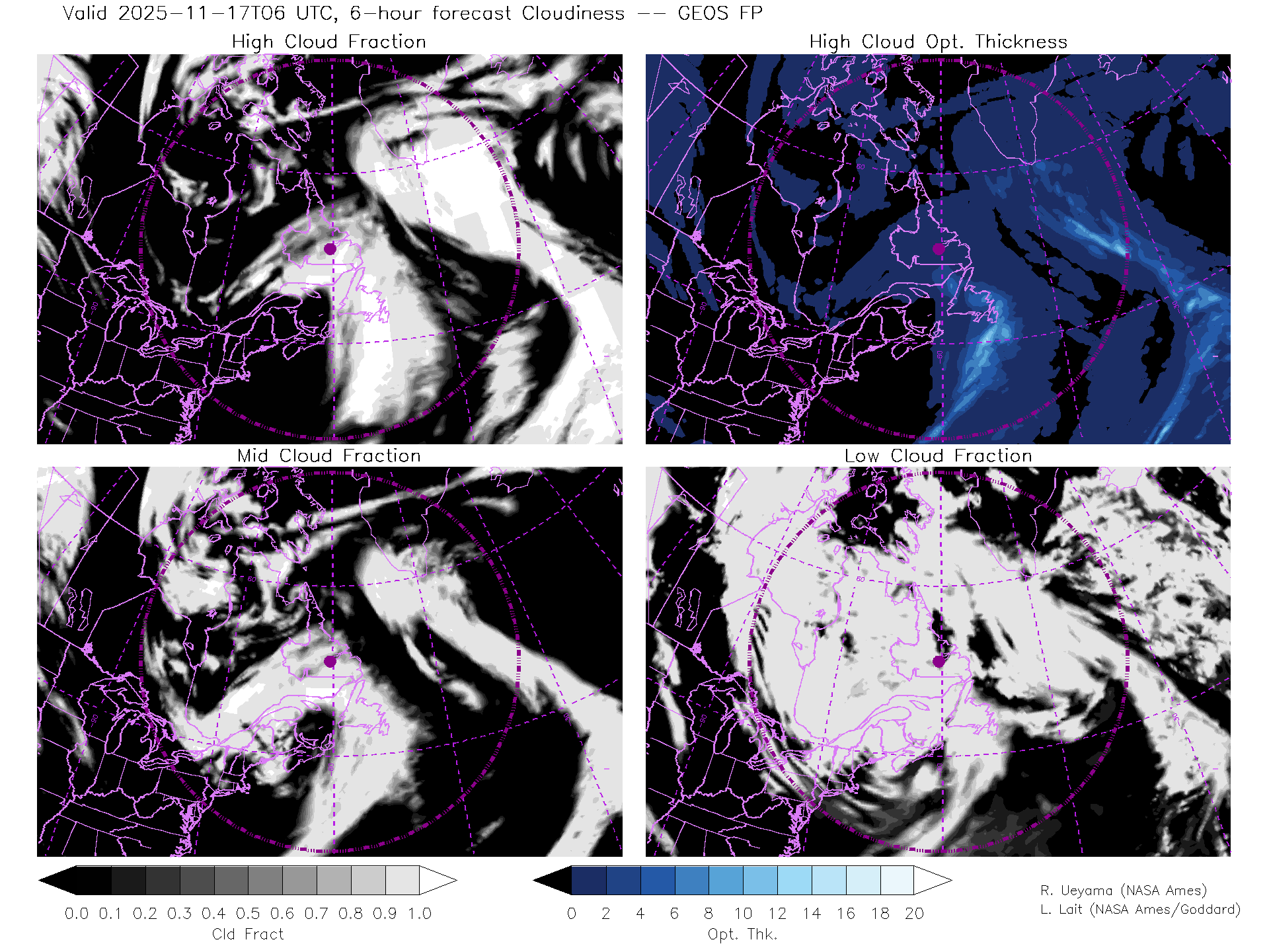 GEOS Forecast Cloud Fraction (High, Mid, Low) & High Cloud Optical Thickness