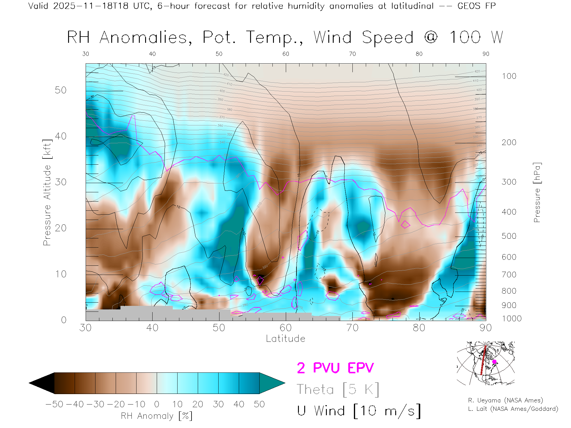 GEOS Forecast Rel. Hum. X-Section (100 W)