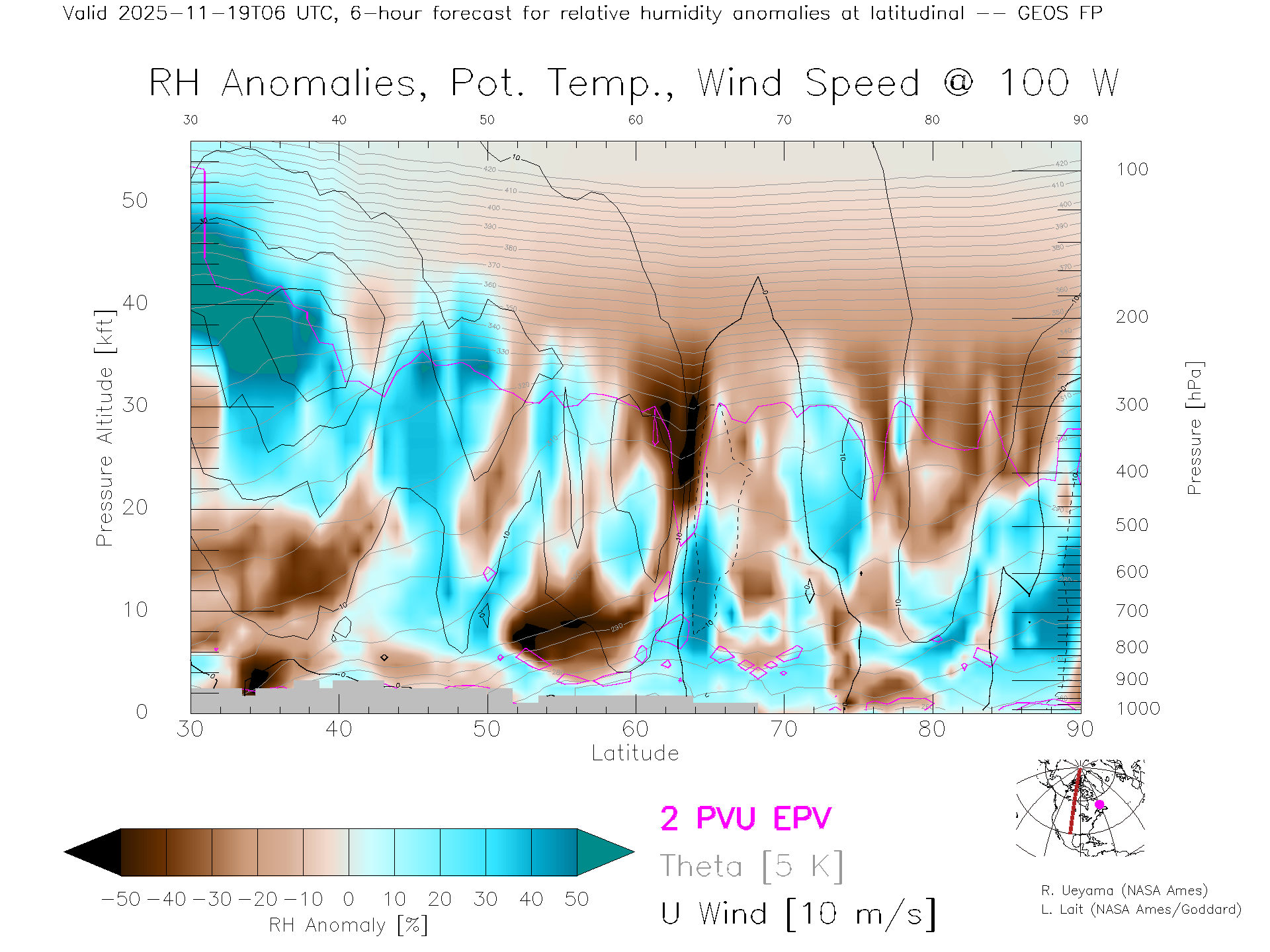 GEOS Forecast Rel. Hum. X-Section (100 W)