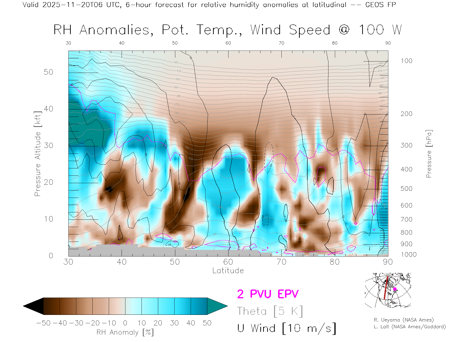 GEOS Forecast Rel. Hum. X-Section (100 W)