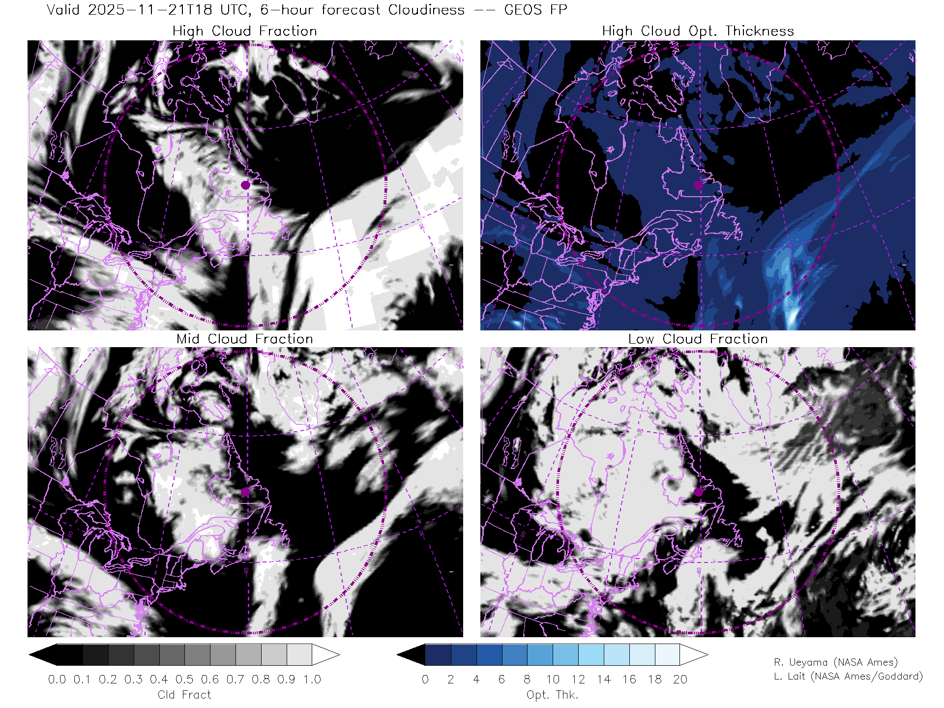 GEOS Forecast Cloud Fraction (High, Mid, Low) & High Cloud Optical Thickness