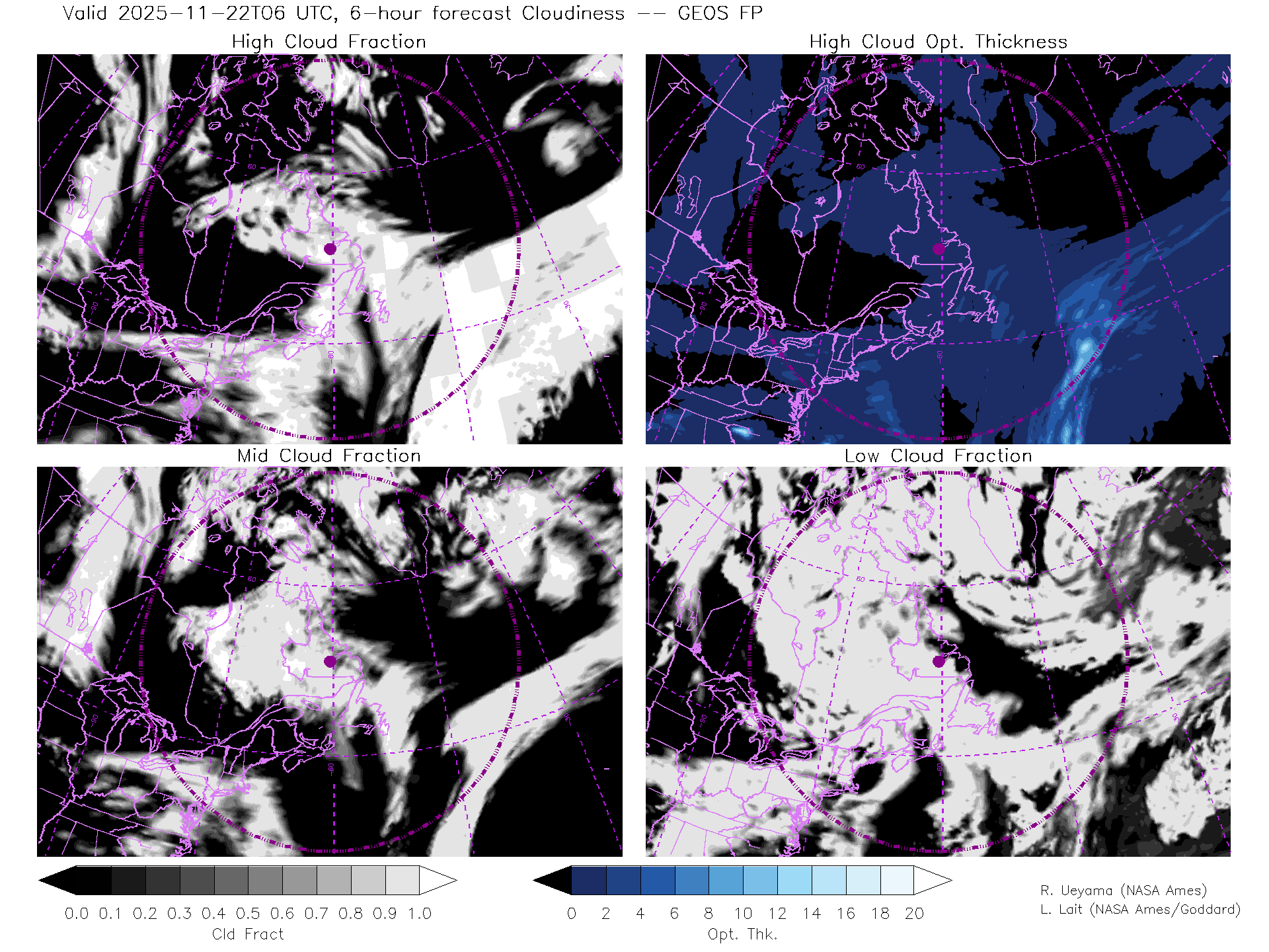 GEOS Forecast Cloud Fraction (High, Mid, Low) & High Cloud Optical Thickness